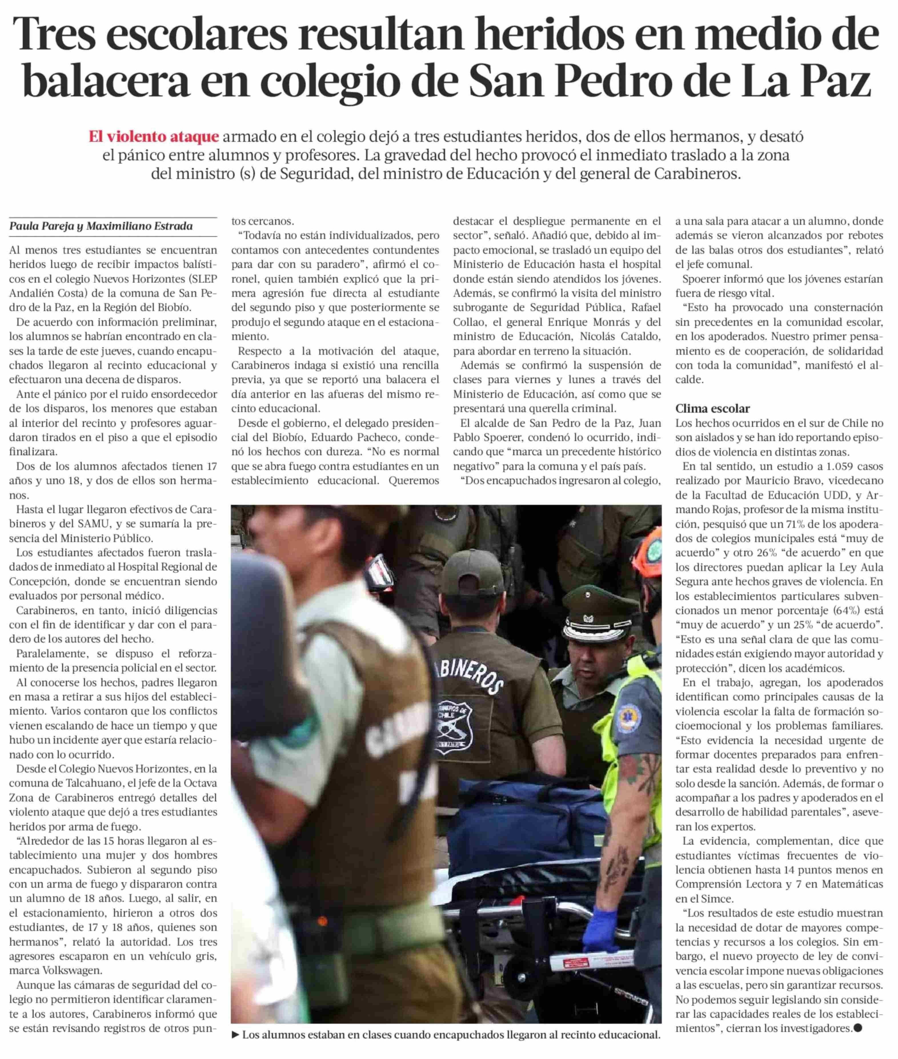 Tres escolares resultan heridos en medio de balacera en colegio de San Pedro de La Paz