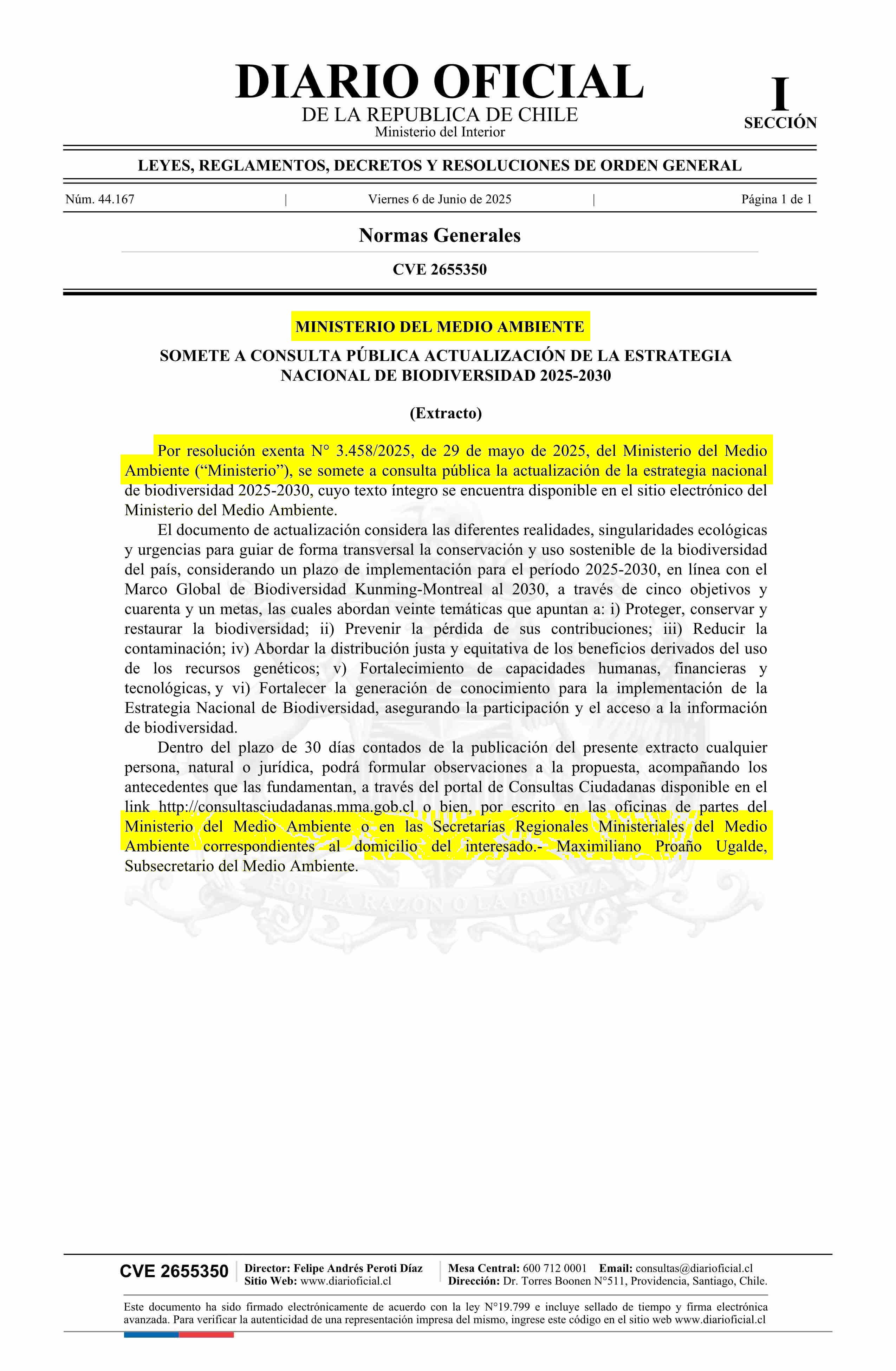 | Título: | Extracto de resolución exenta número 3.458, de 2025.- Somete a consulta pública actualización de la Estrategia Nacional de Biodiversidad 2025-2030 |