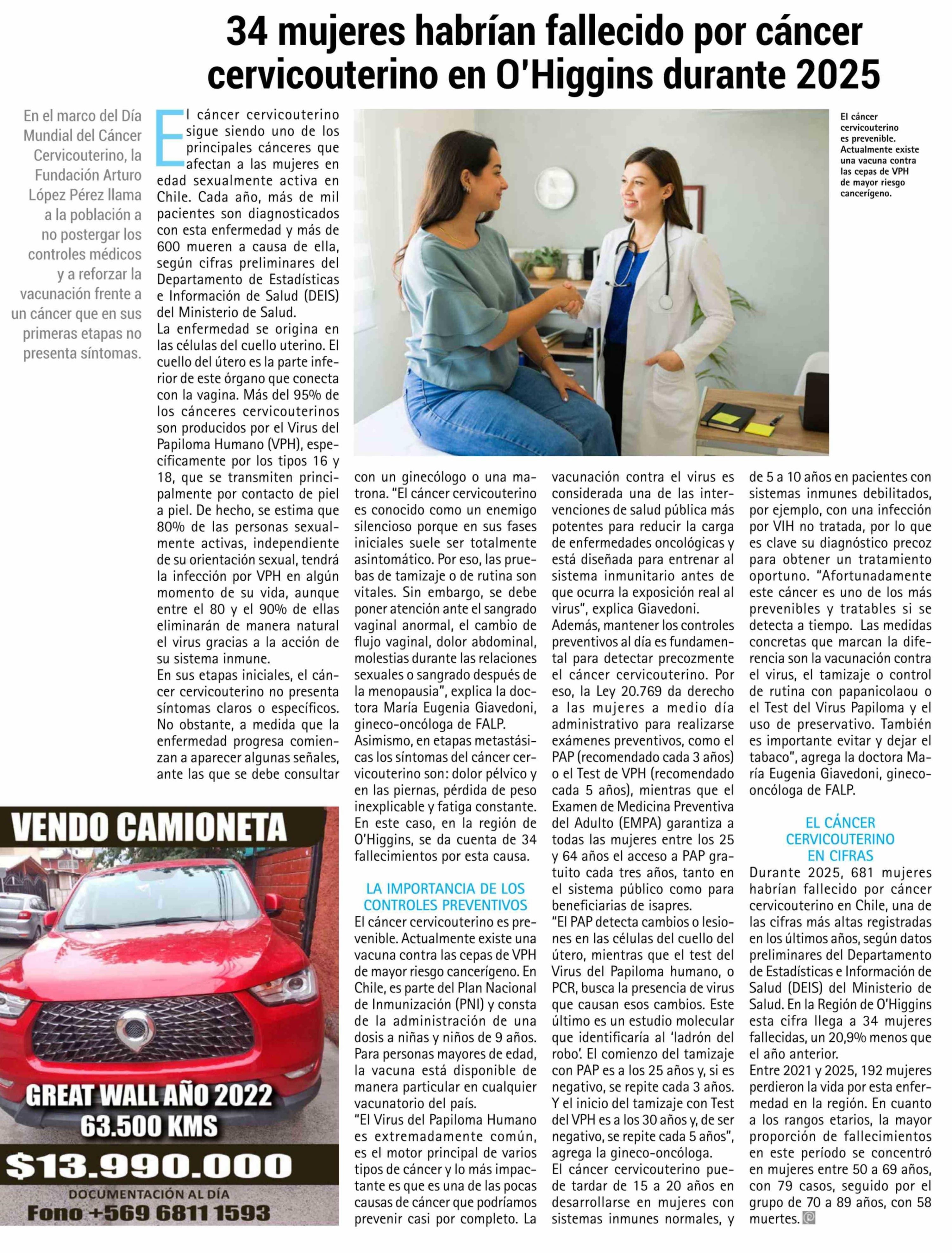 Título: 34 Mujeres habrían fallecido por cancer cervicouterino en O'Higgins durante 2025