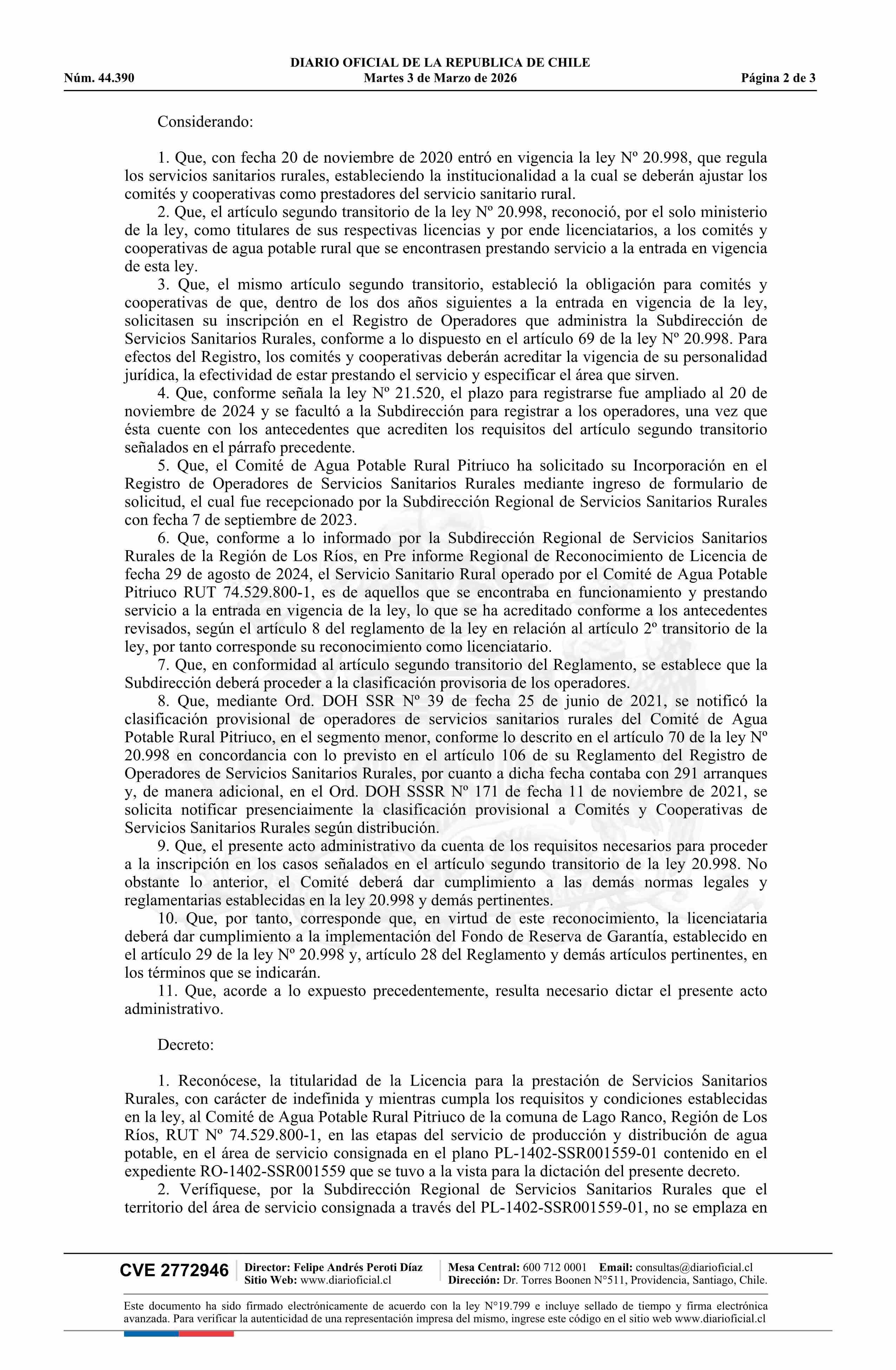 Título: Decreto exento número 37, de 2026.- Reconoce licencia de servicio sanitario rural al Comité de Agua Potable Rural Pitriuco, comuna de Lago Ranco, provincia de Ranco, Región de Los Ríos, y da cuenta de su registro como operador