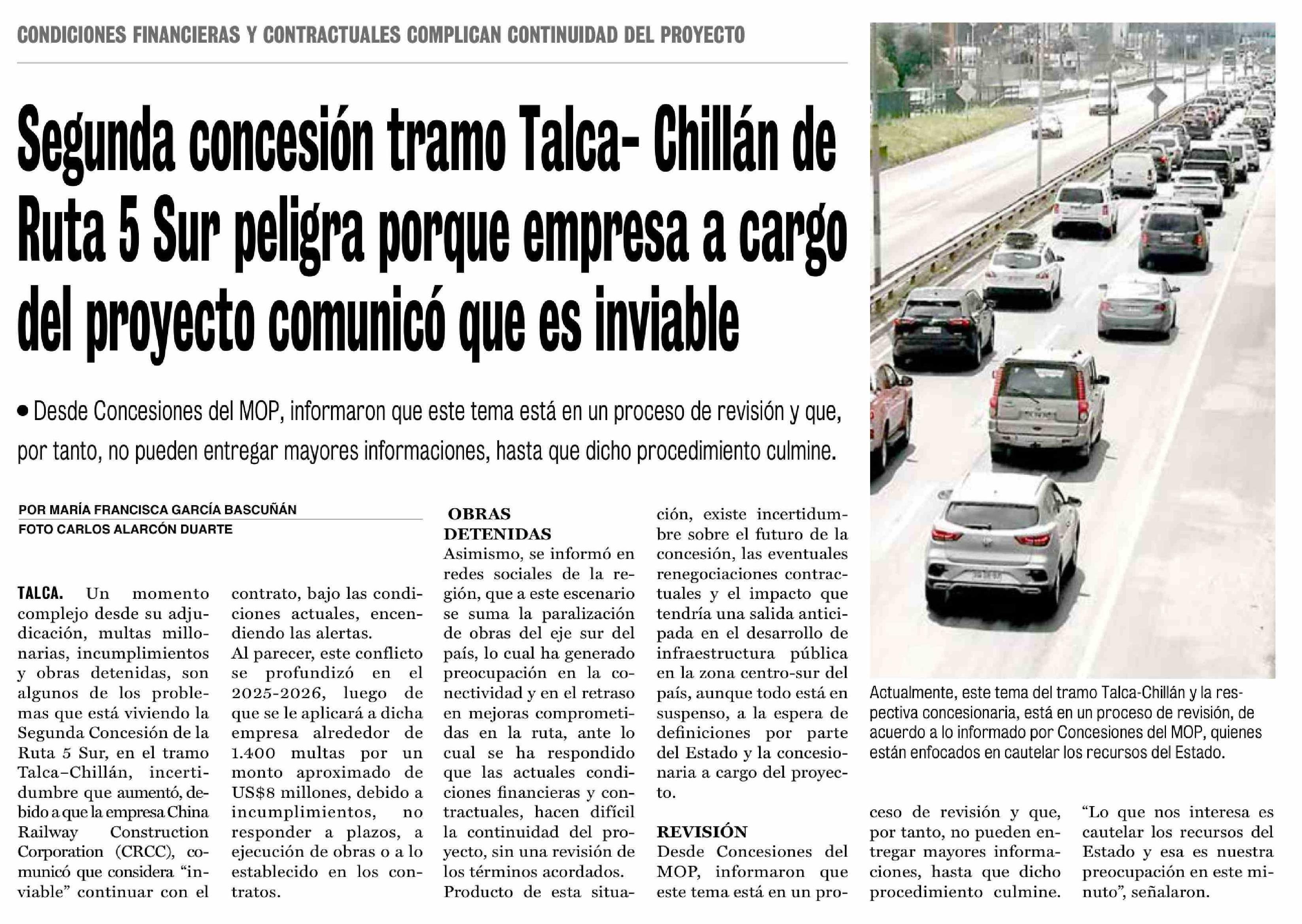 Segunda concesión tramo Talca- Chillán de Ruta 5 Sur peligra porque empresa a cargo del proyecto comunicó que es inviable
