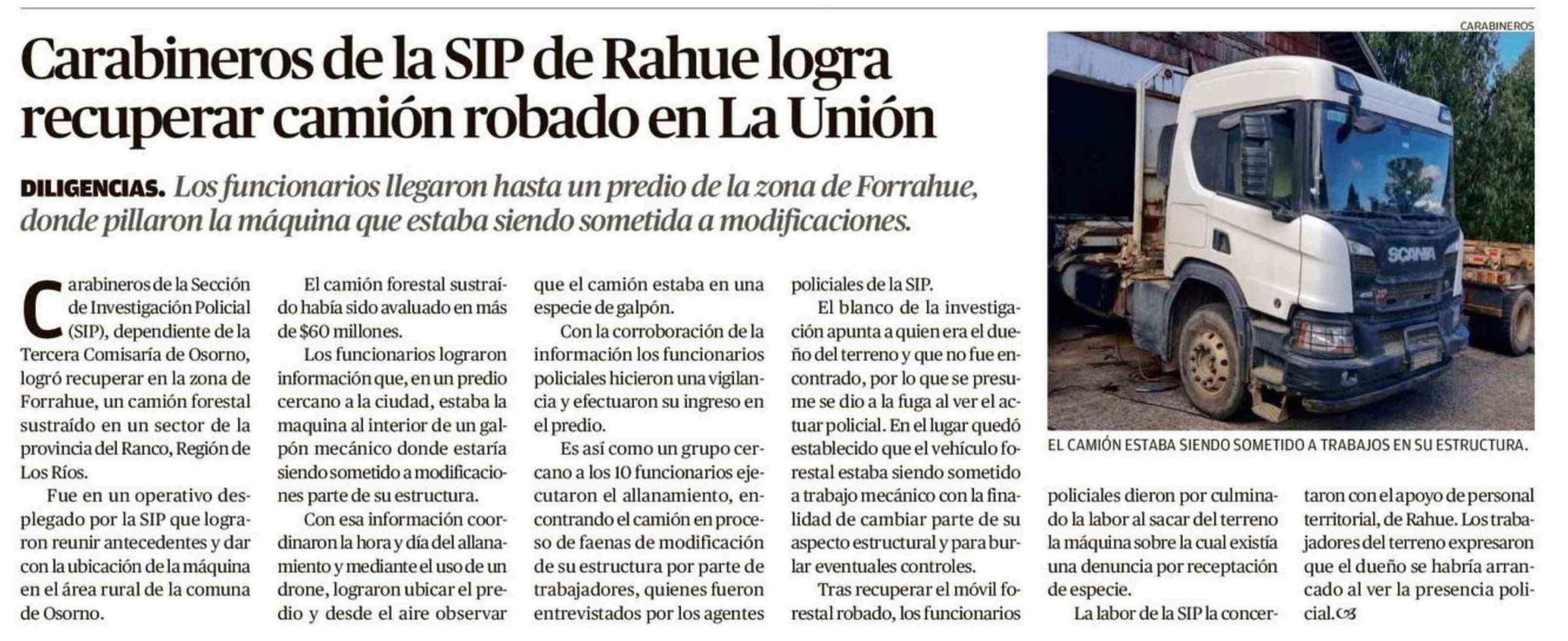 Carabineros de la SIP de Rahue logra recuperar camión robado en La Unión