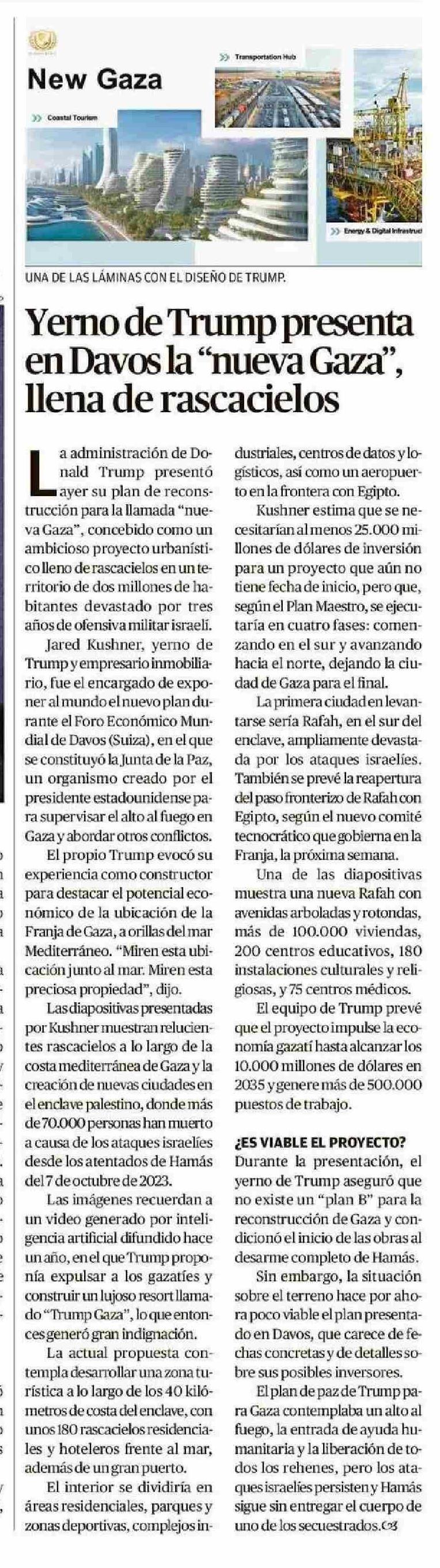 Yerno de Trump presenta en Davos la "nueva Gaza", llena de rascacielos
