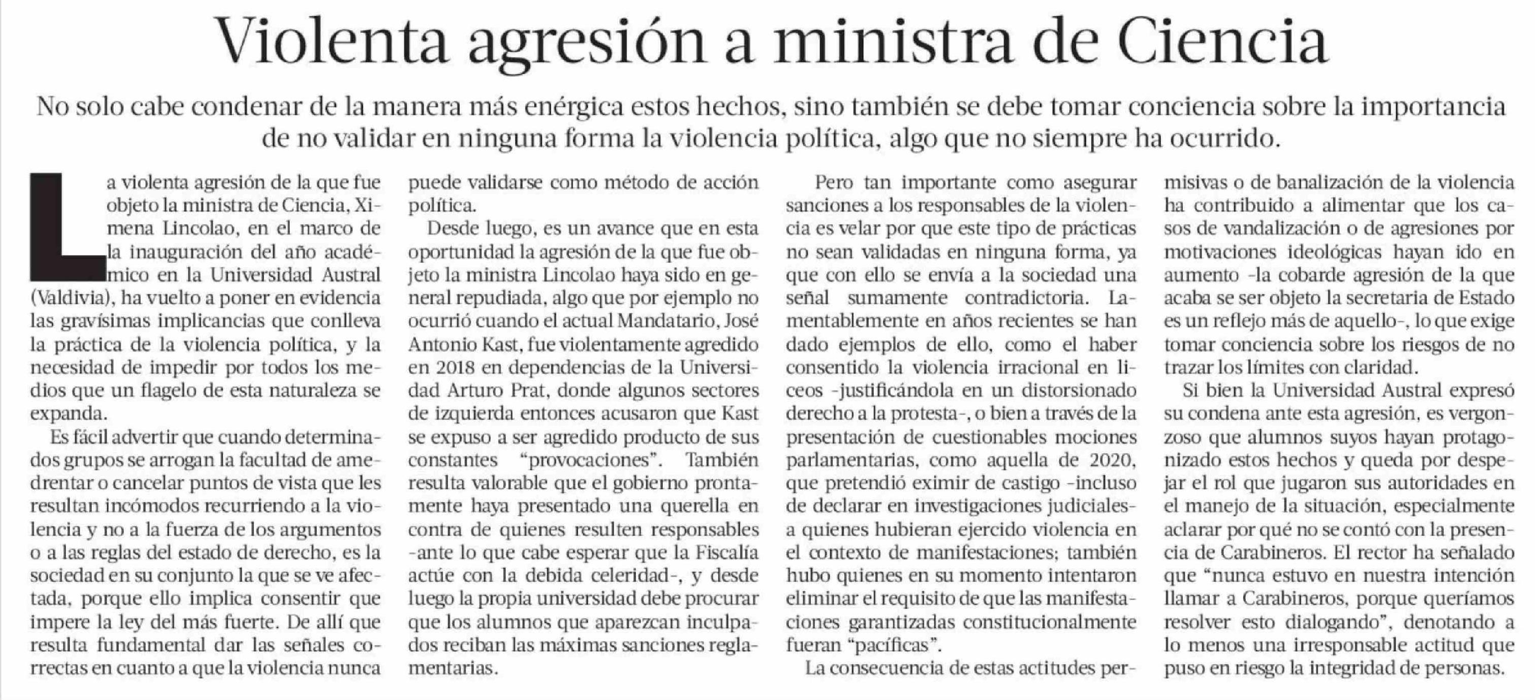 Título: EDITORIAL: Violenta agresión a ministra de Ciencia