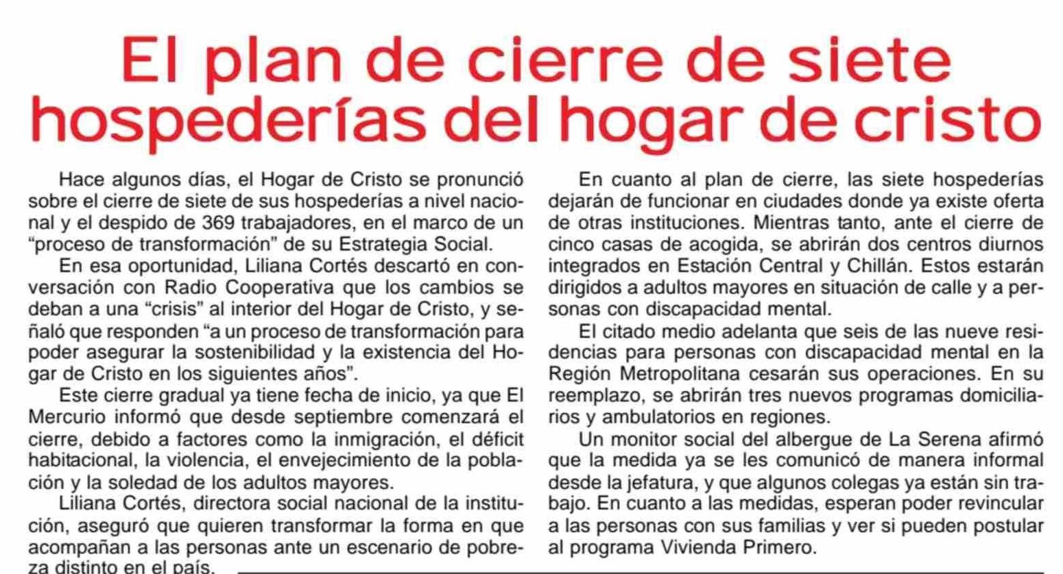 El plan de cierre de siete hospederías del hogar de cristo