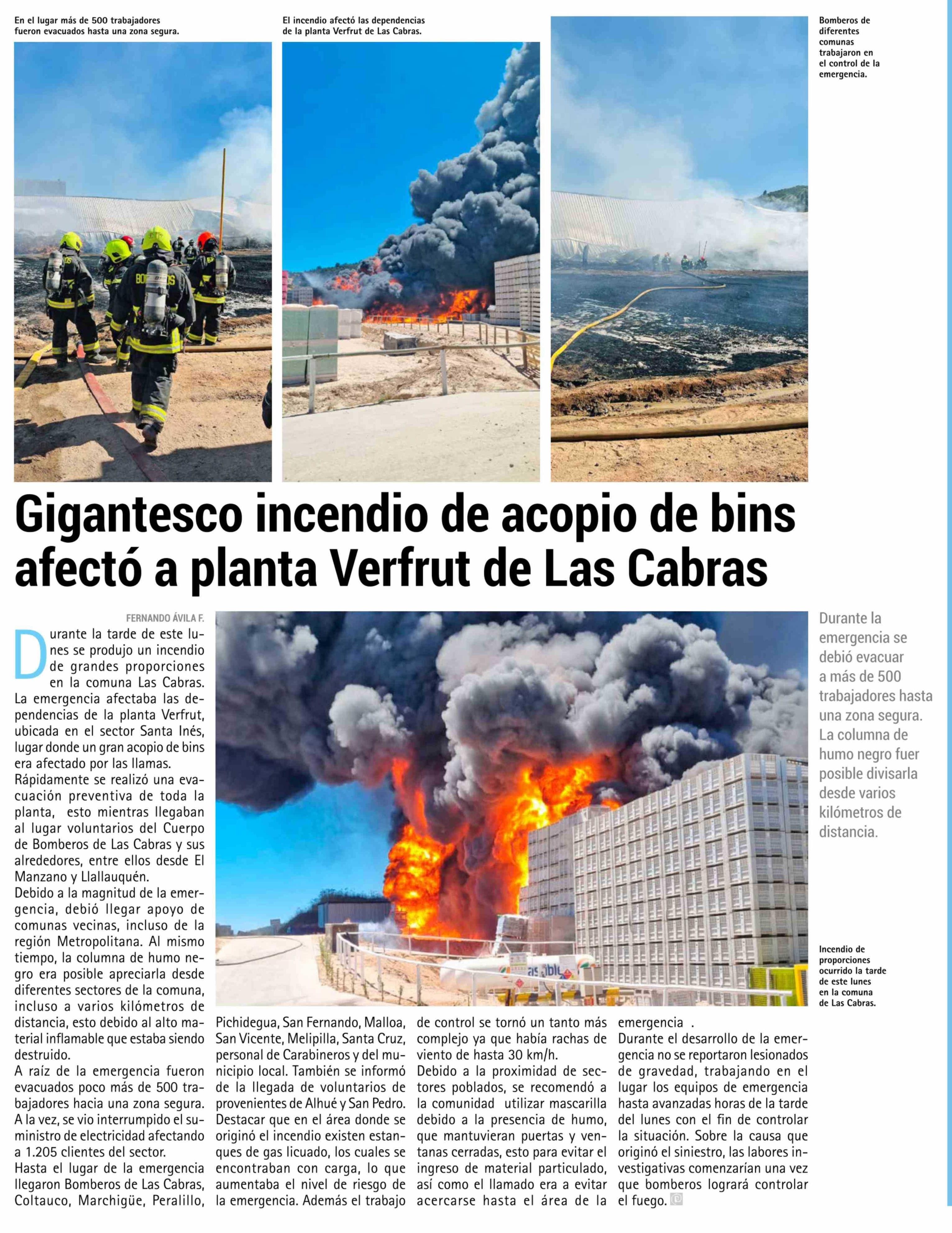 Gigantesco incendio de acopio de bins afectó a planta Verfrut de Las Cabras