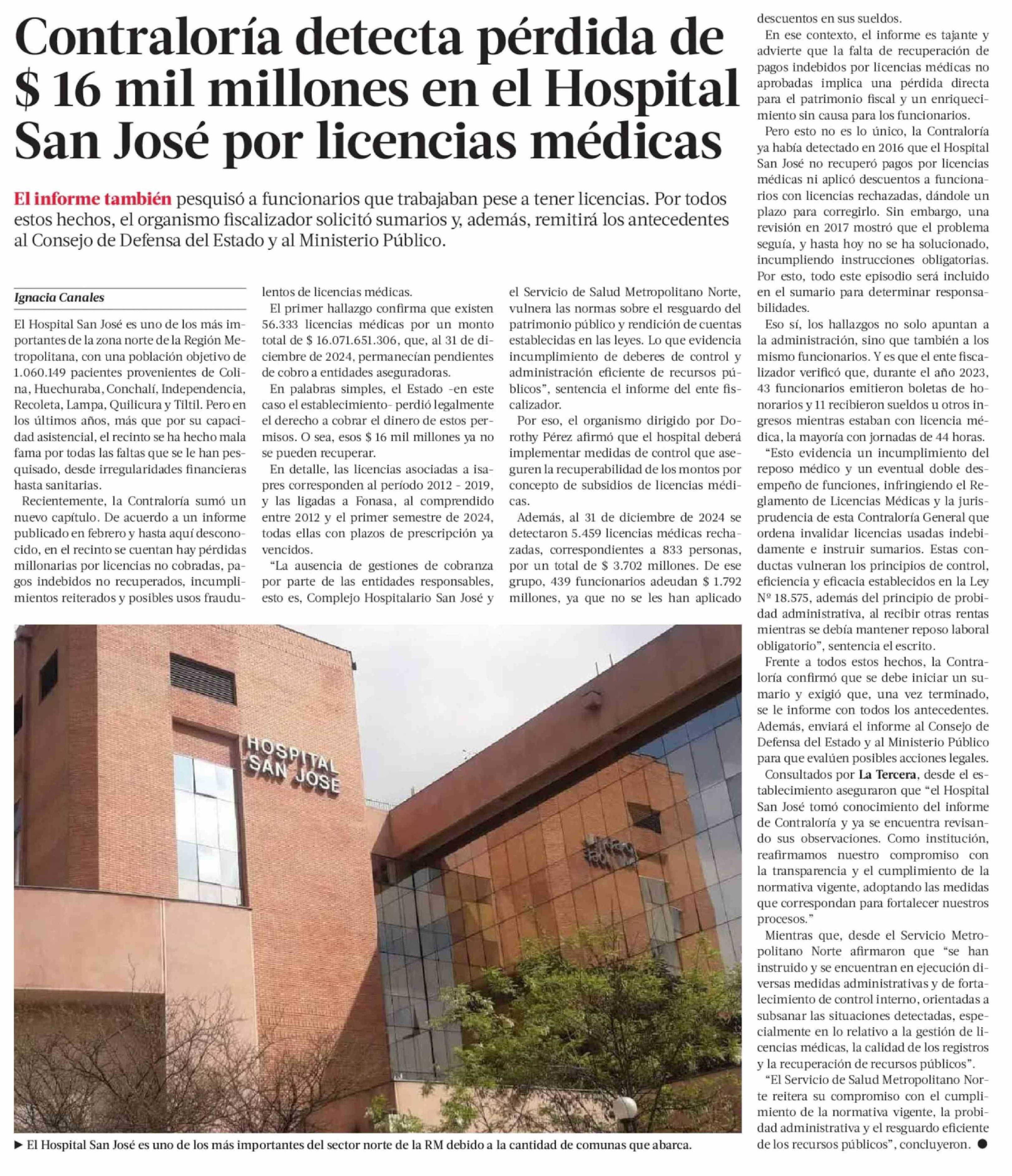 Contraloría detecta pérdida de $ 16 mil millones en el Hospital San José por licencias médicas