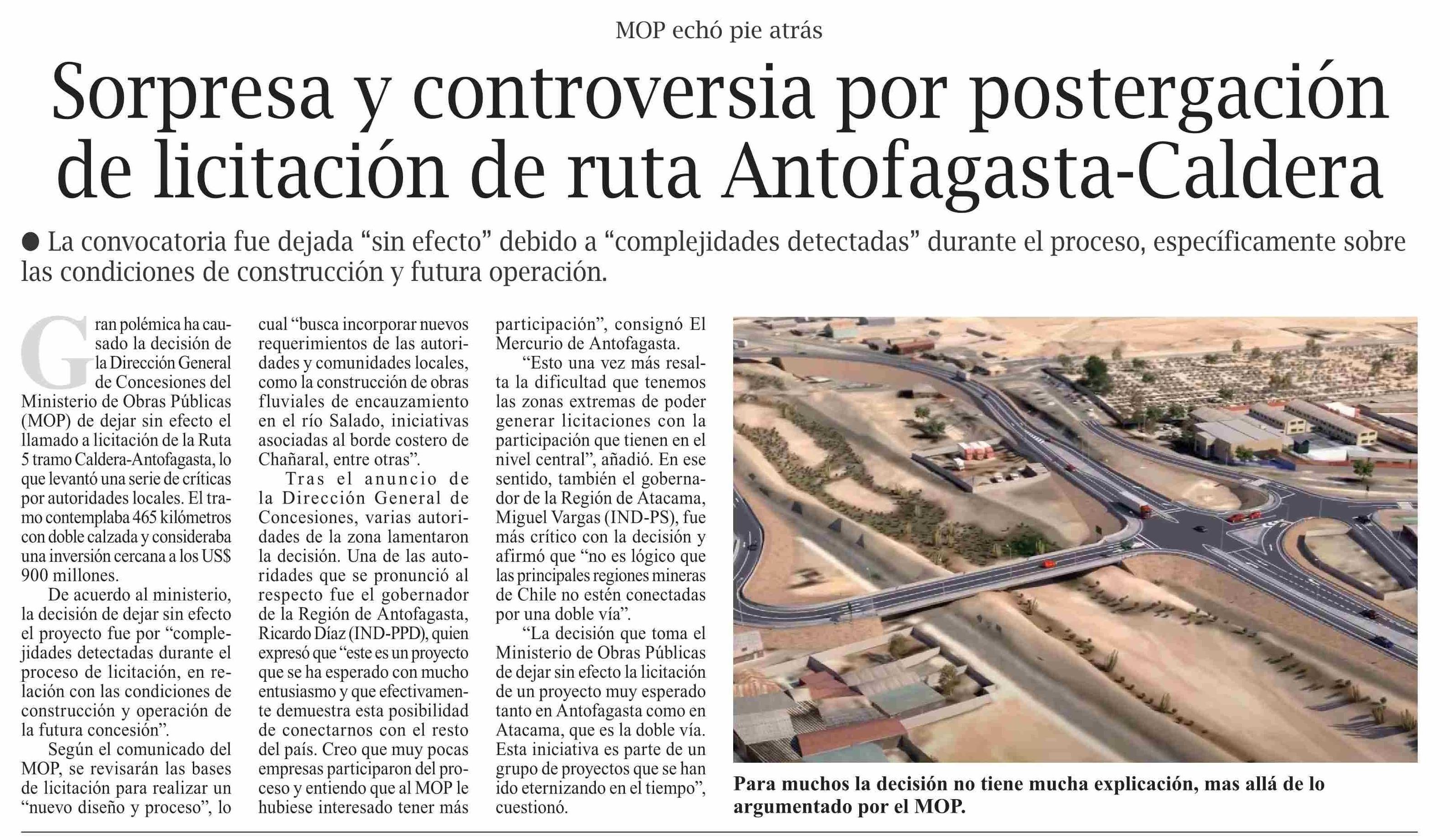 Sorpresa y controversia por postergación de licitación de ruta Antofagasta-Caldera
