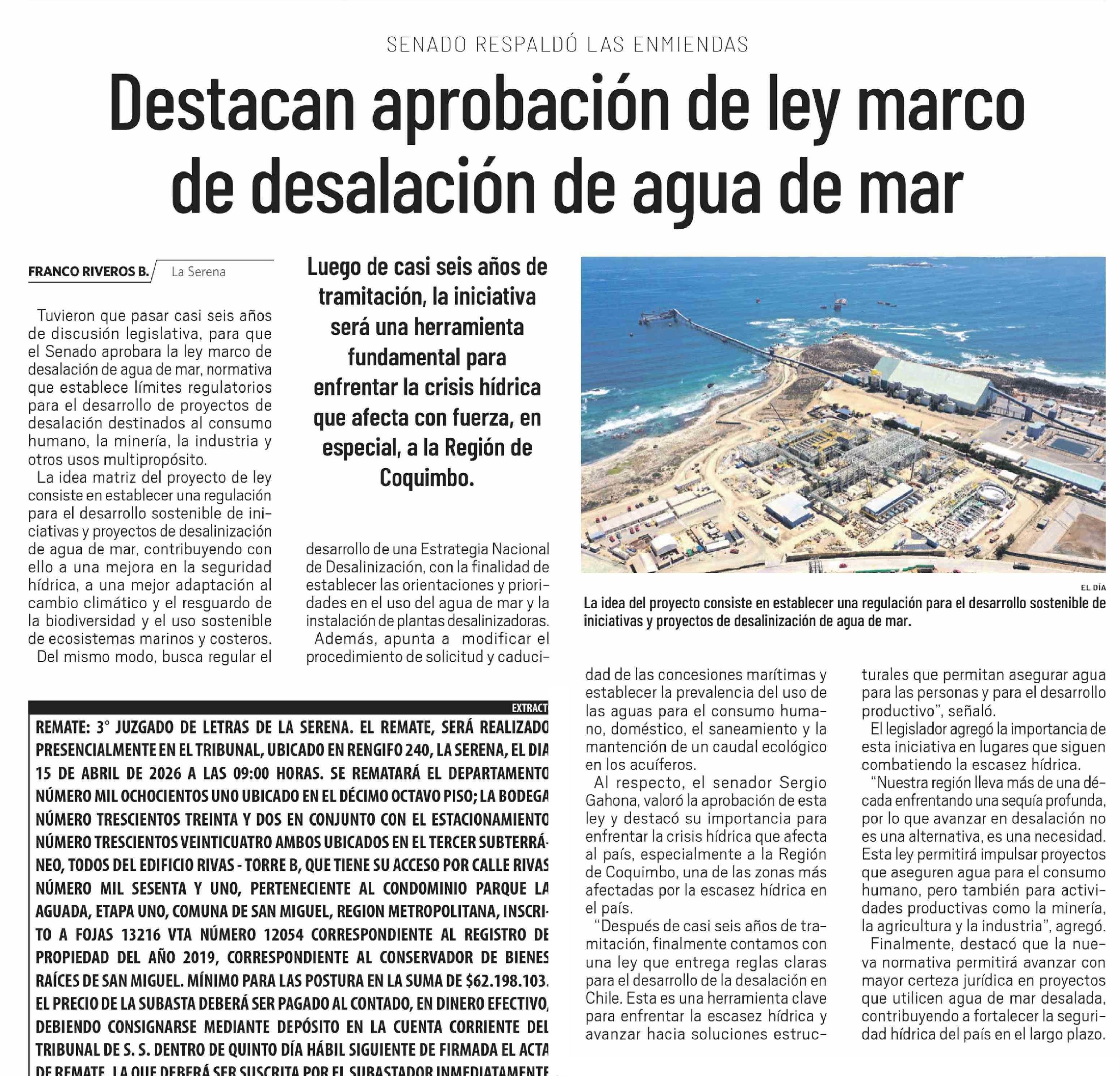 Destacan aprobación de ley marco de desalación de agua de mar