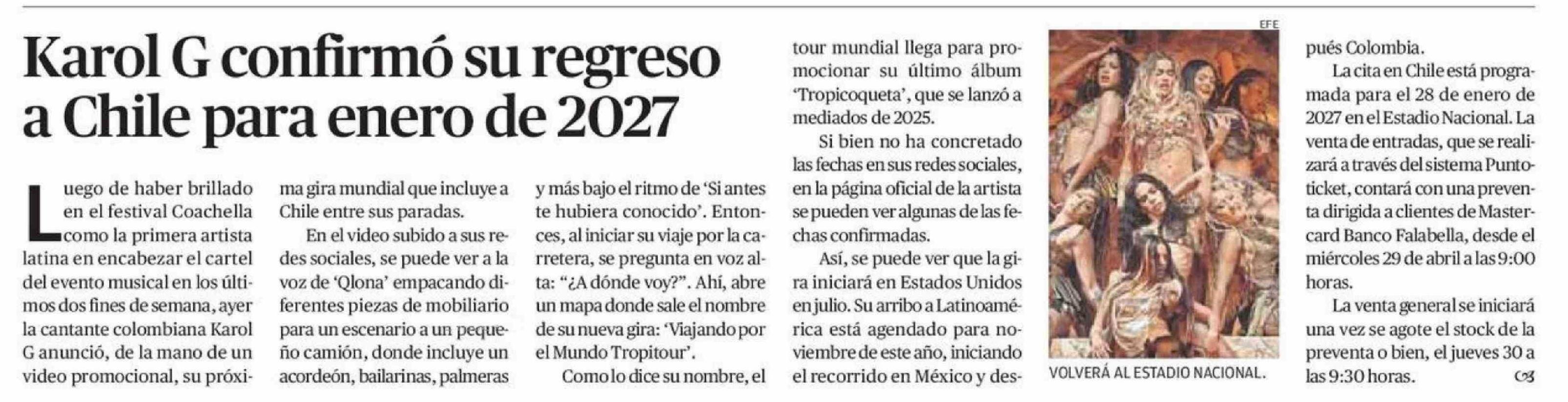 Karol G confirmó su regreso a Chile para enero de 2027