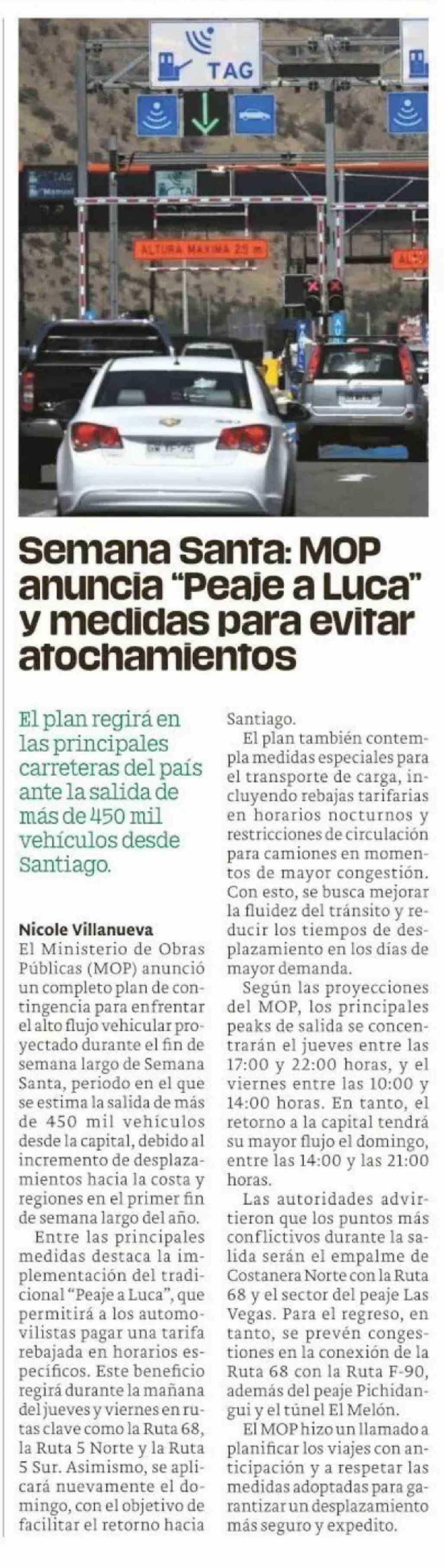 Semana Santa: MOP anuncia "Peaje a Luca" y medidas para evitar atochamientos