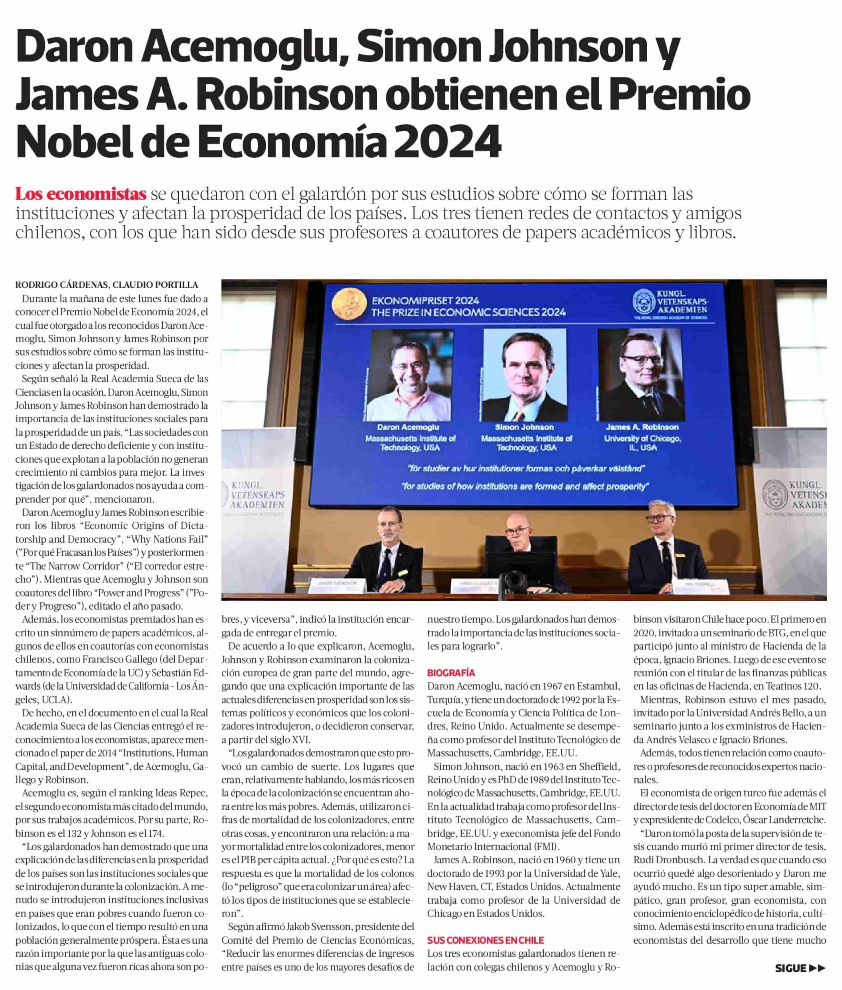 Daron Acemog]lu, Simon Johnson y James A. Robinson obtienen el Premio Nobel de Economía 2024