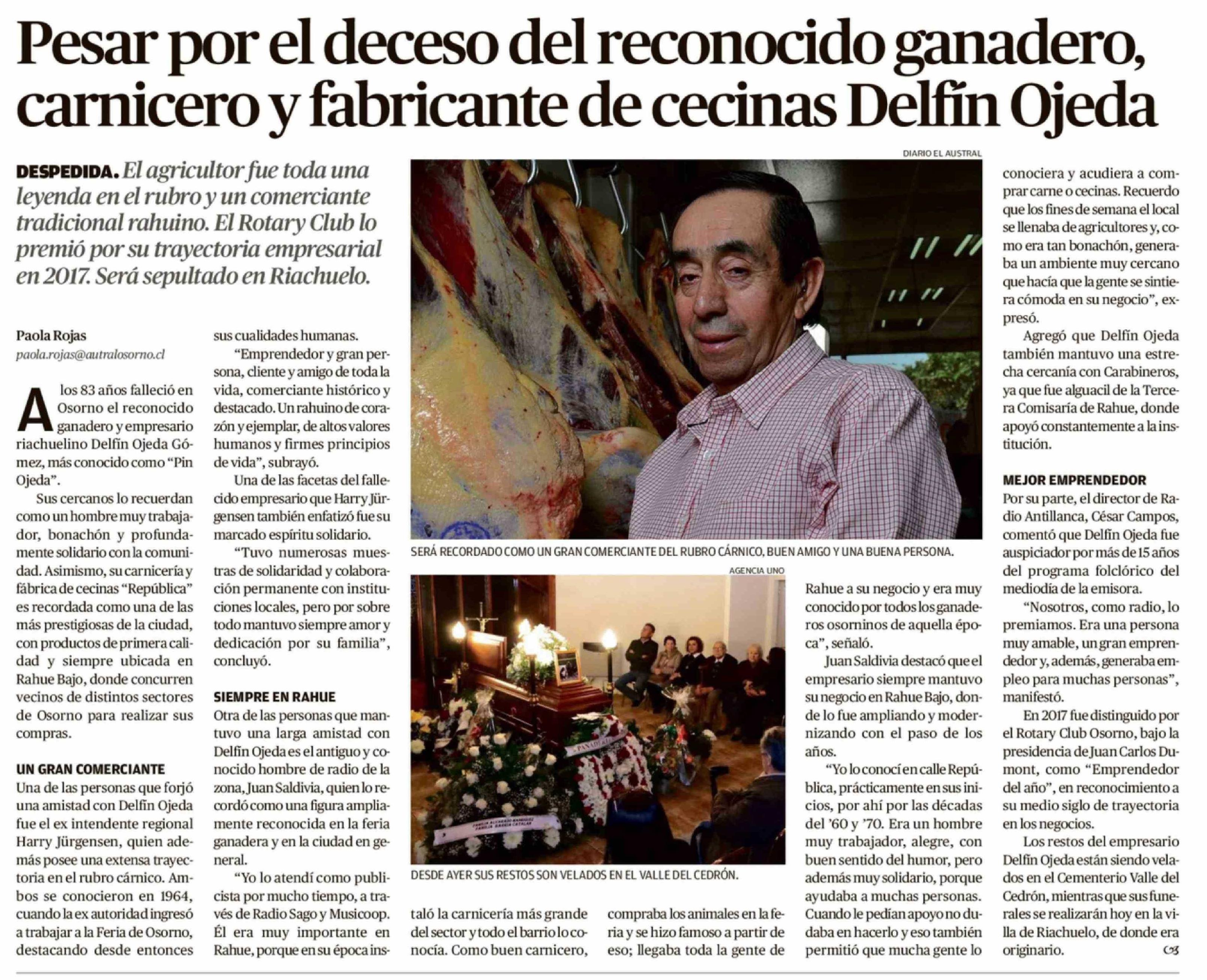 Pesar por el deceso del reconocido ganadero, carnicero y fabricante de cecinas Delfin Ojeda