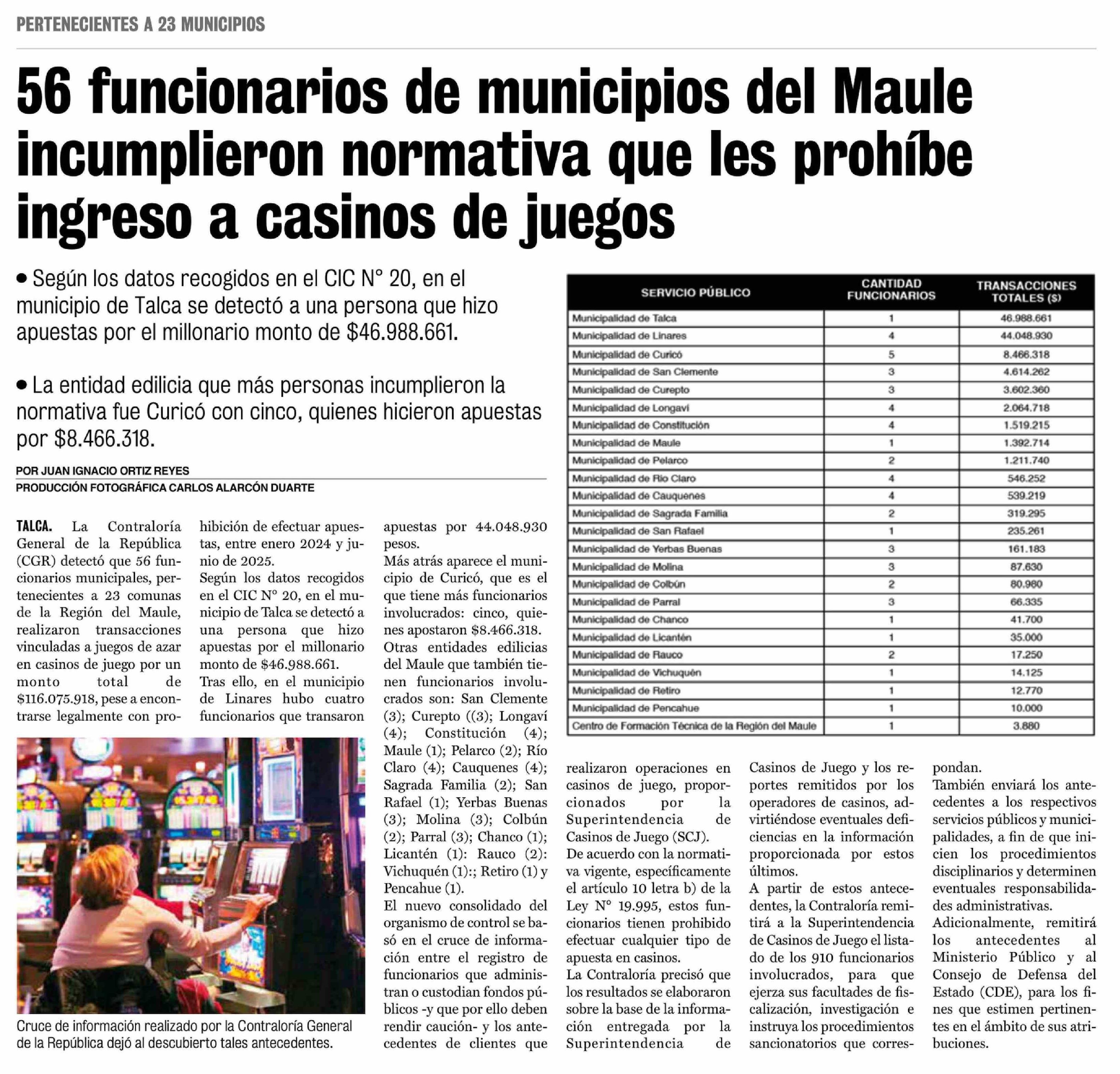 56 Funcionarios de municipios del Maule incumplieron normativa que les prohíbe ingreso a casinos de juegos