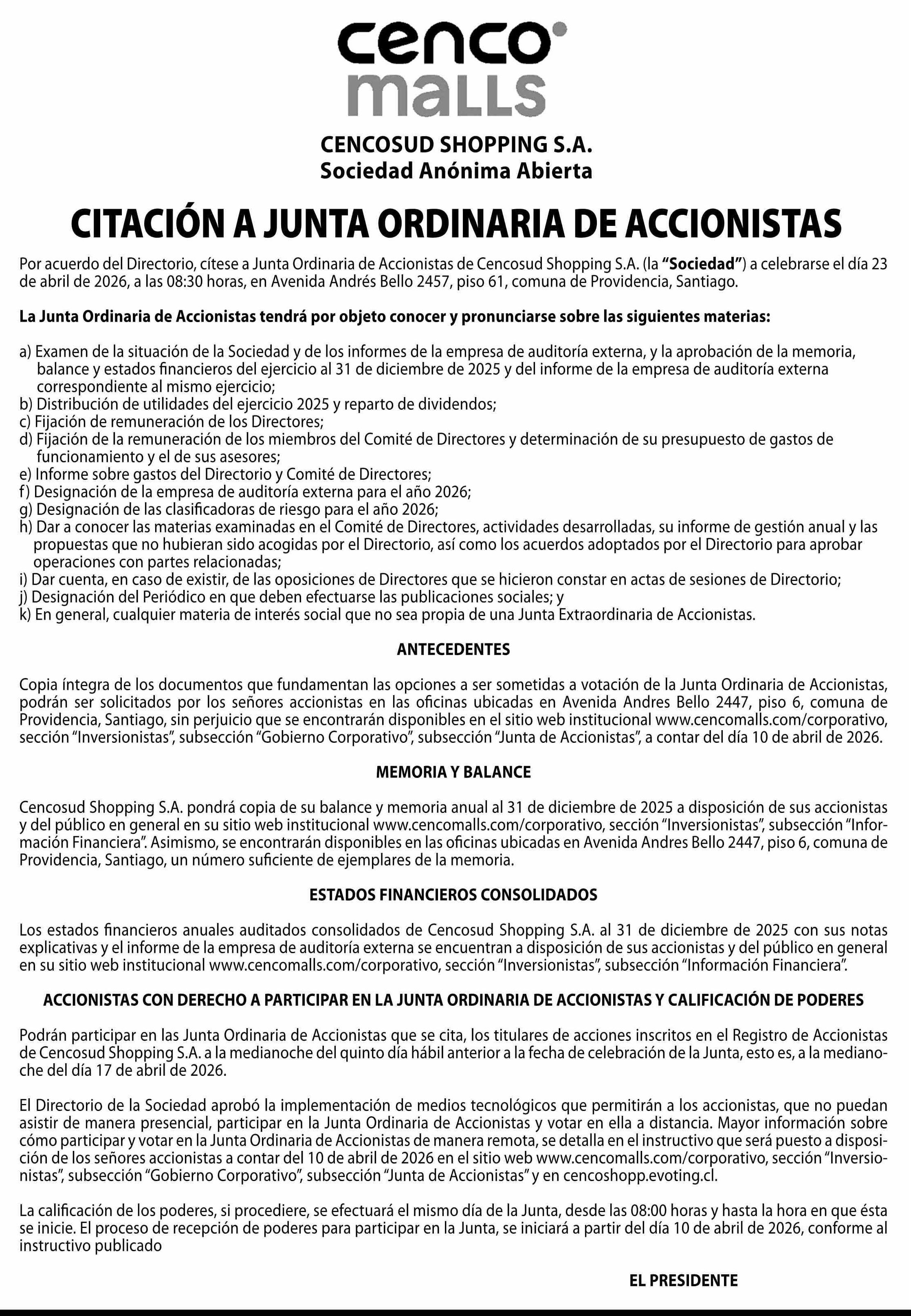 Extractos: CENCOSUD SHOPPING S.A.