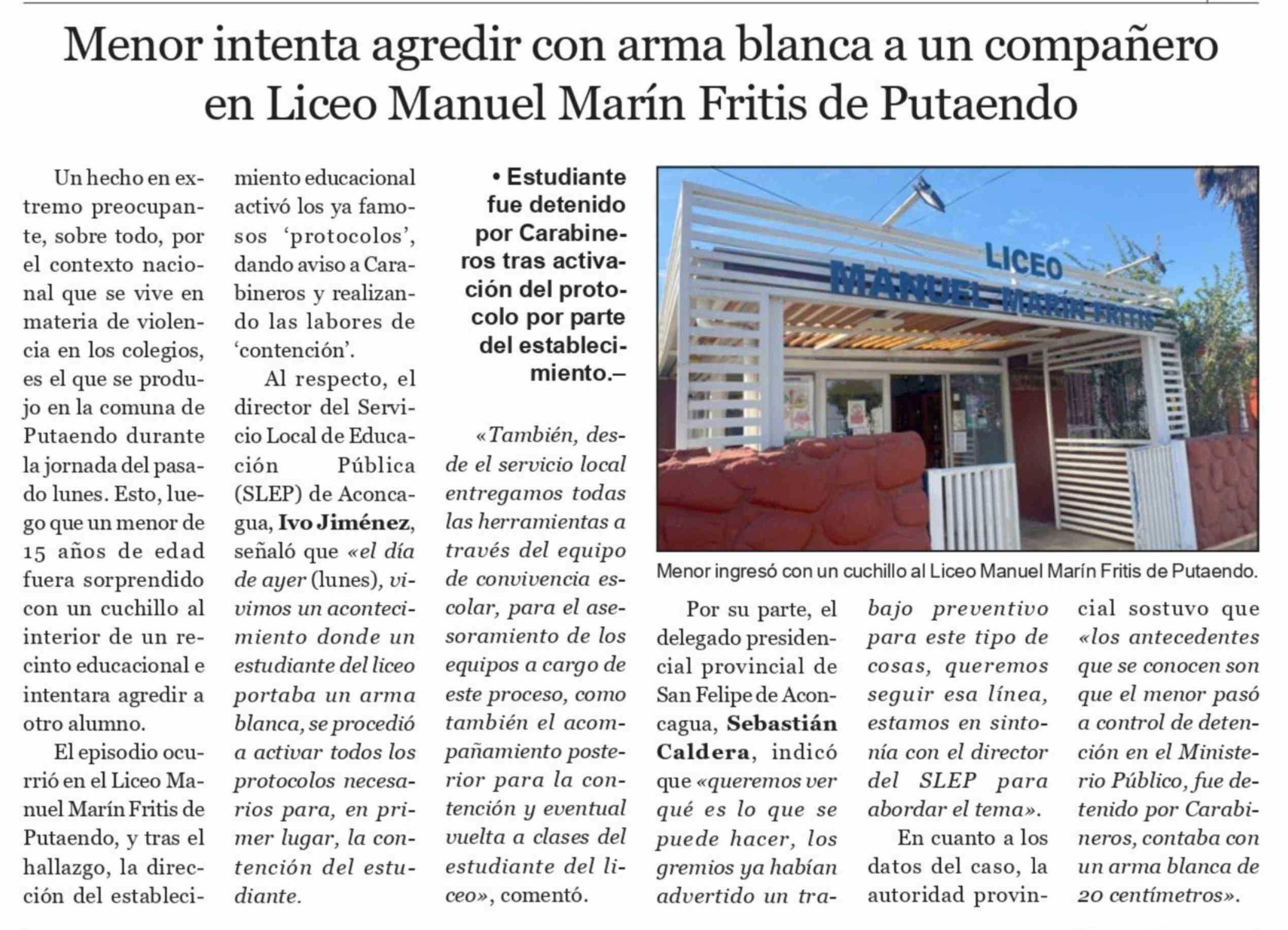 Título: Menor intenta agredir con arma blanca a un compañero en Liceo Manuel Marín Fritis de Putaendo