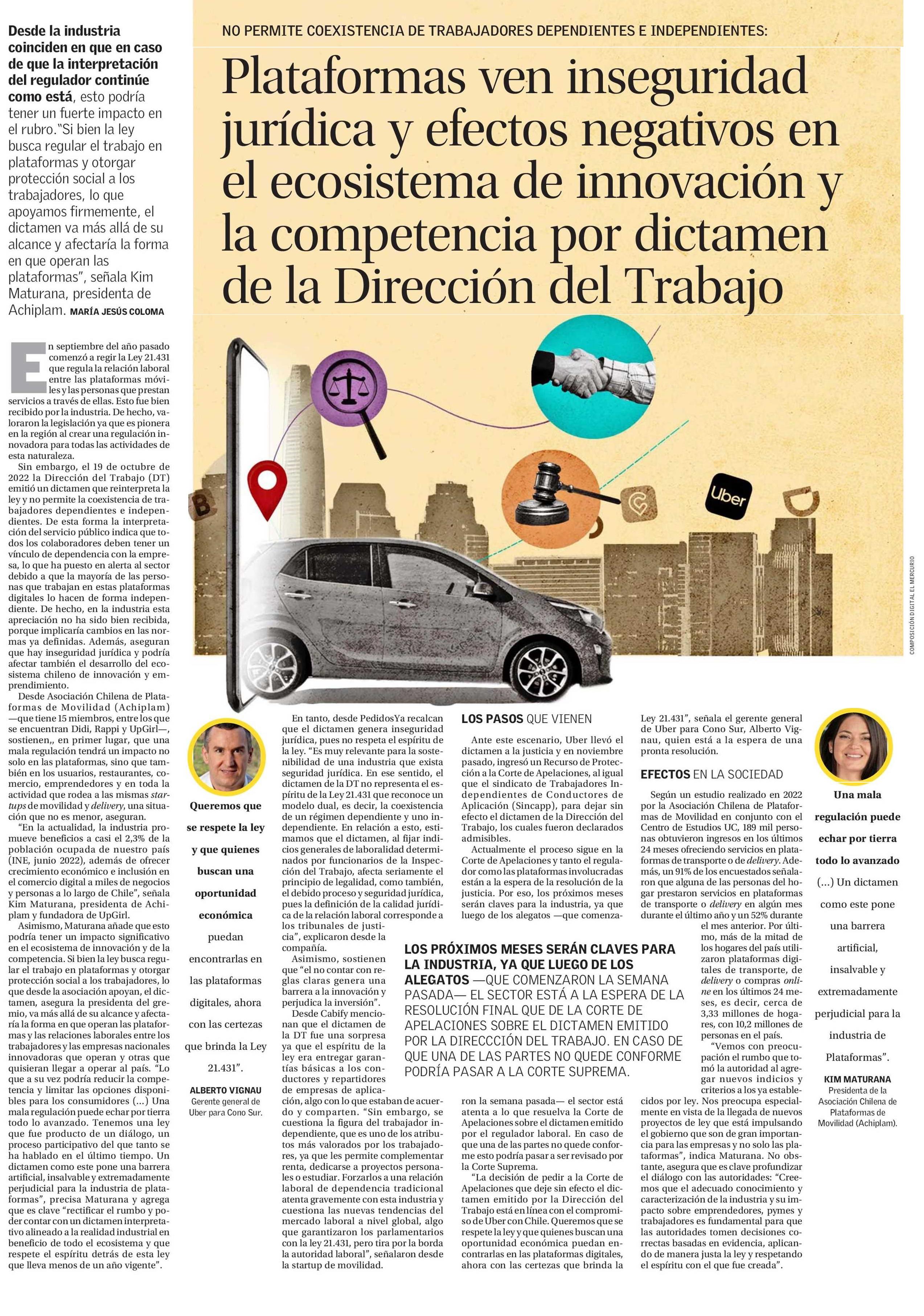 | Título: | Plataformas ven inseguridad jurídica y efectos negativos en el ecosistema de innovación y la competencia por dictamen de la Dirección del Trabajo |
