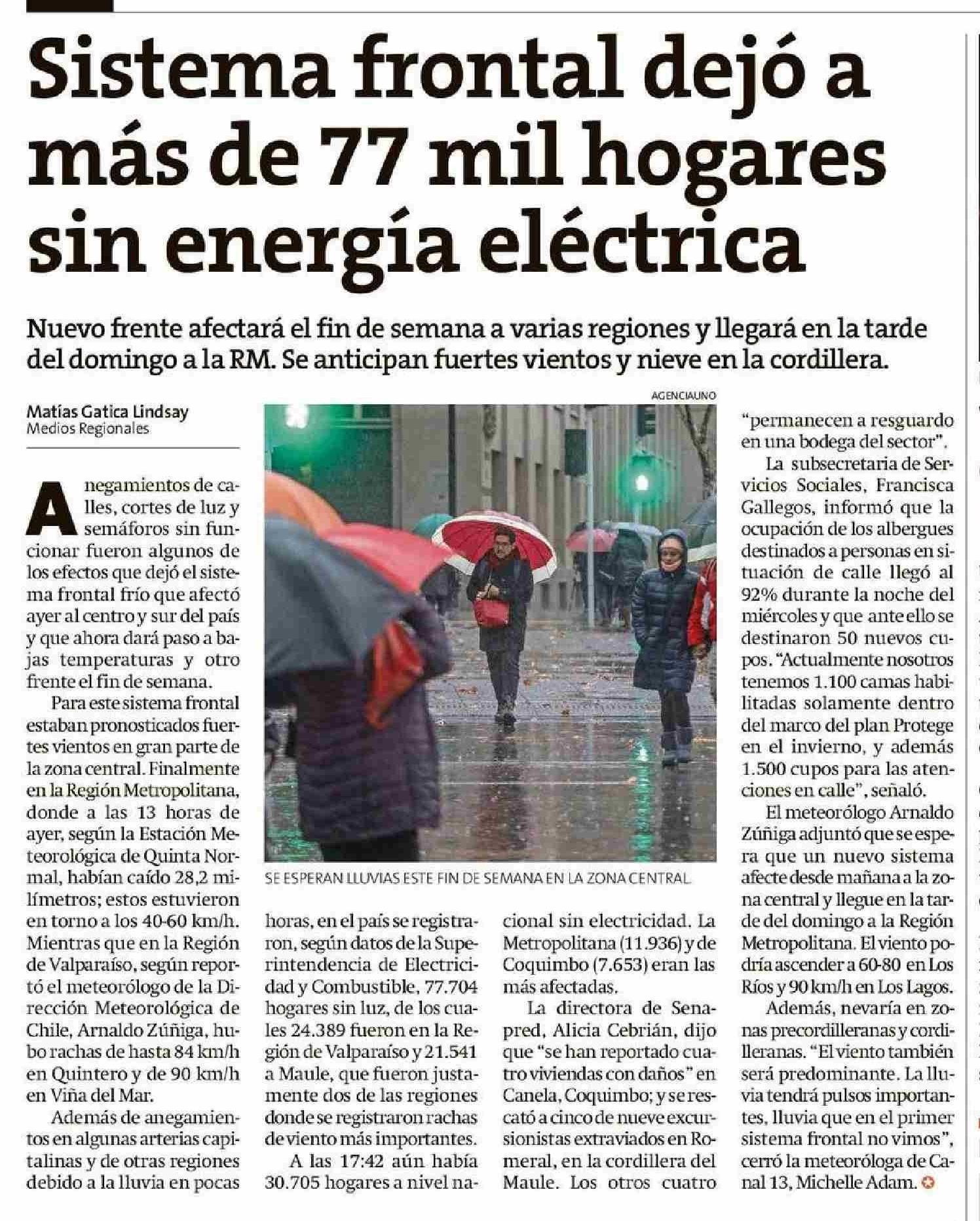 Sistema frontal dejó a más de 77 mil hogares sin energía eléctrica