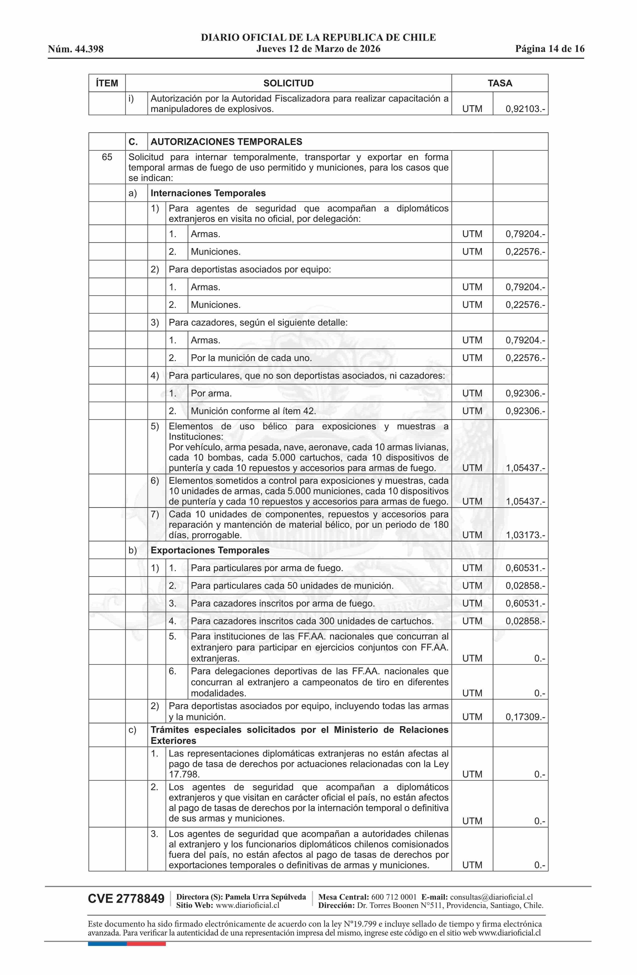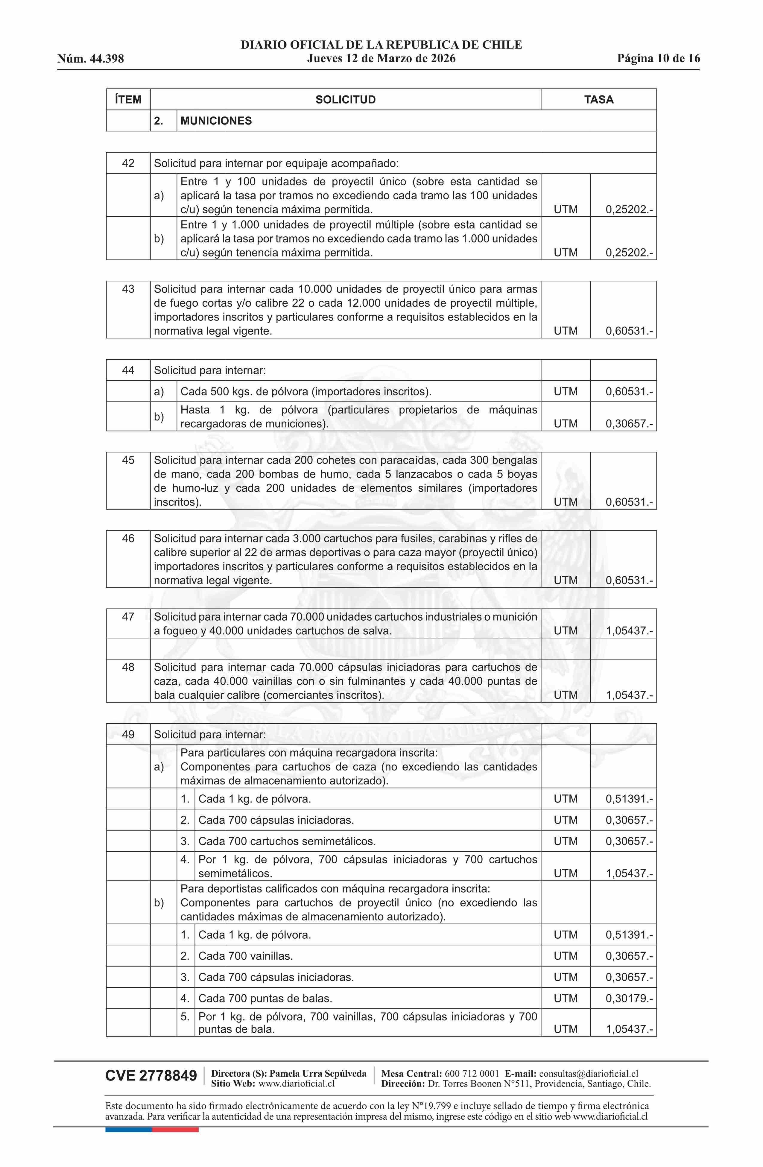 Título: Decreto exento número 1, de 2026.- Fija tasas de derechos a solicitudes de la ley N° 17.798, sobre Control de Armas