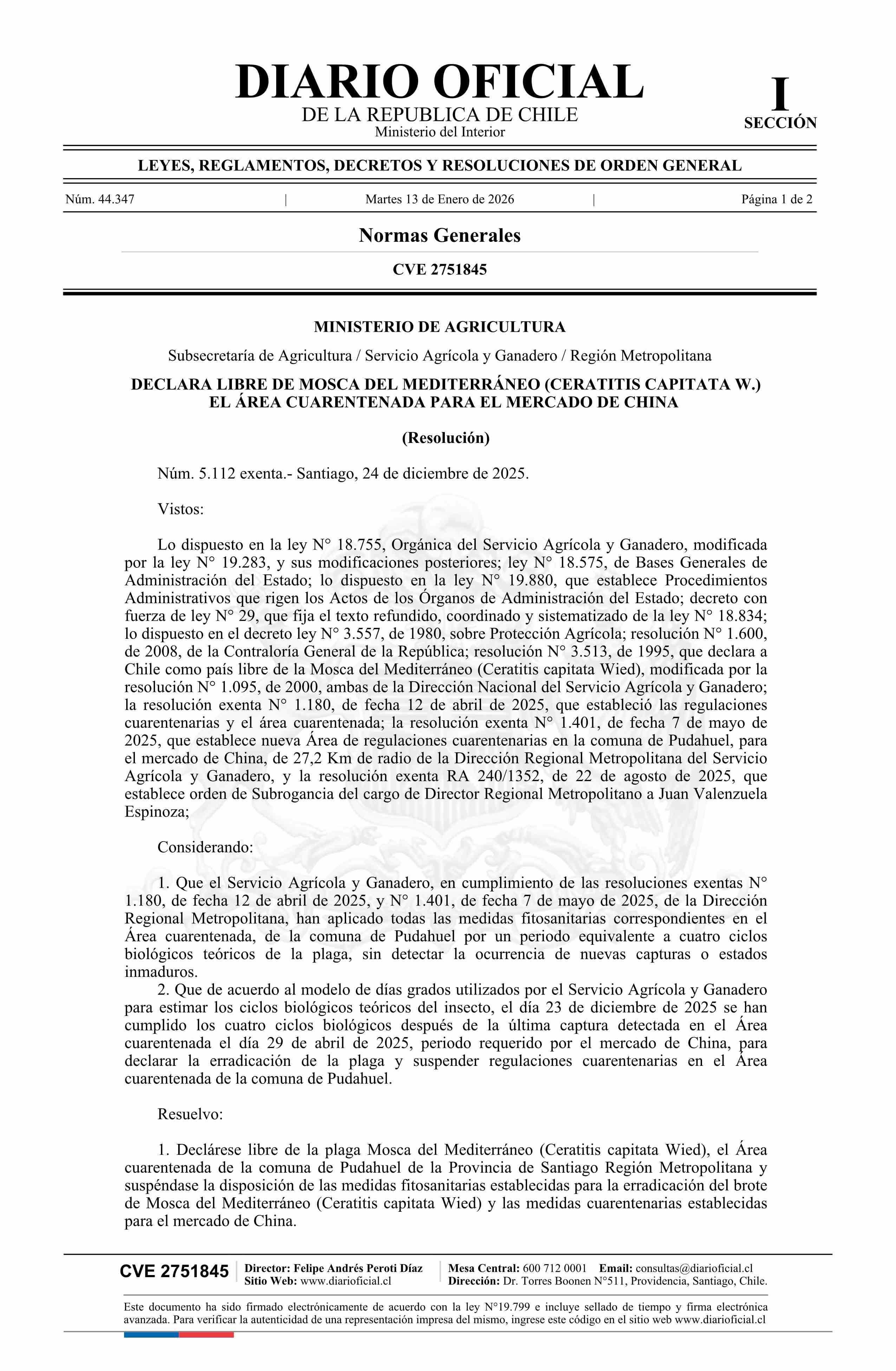 | Título: | Resolución exenta número 5.112, de 2025.- Declara libre de Mosca del Mediterráneo (Ceratitis capitata W.) el área cuarentenada para el Mercado de China |