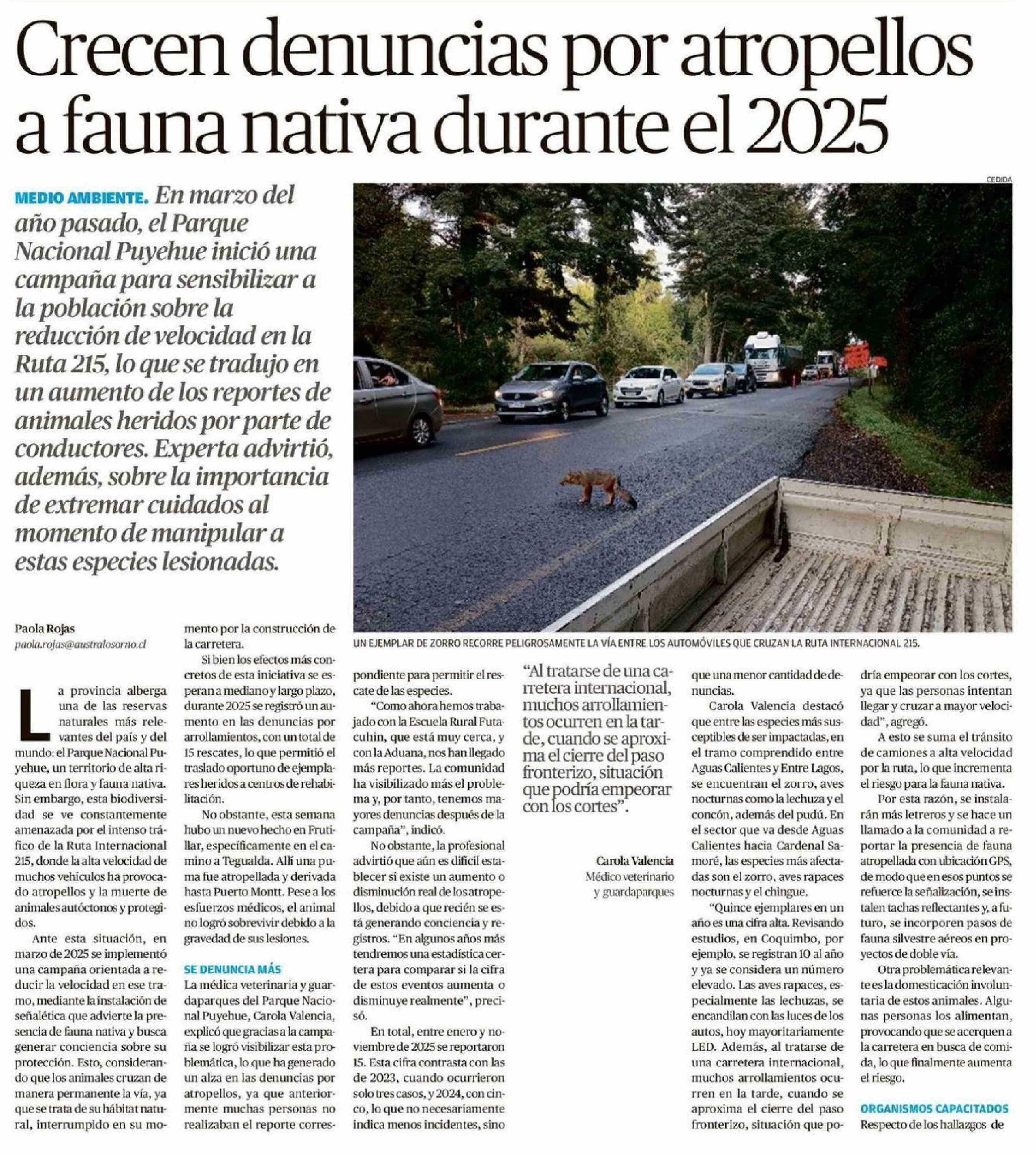 Crecen denuncias por atropellos a fauna nativa durante el 2025