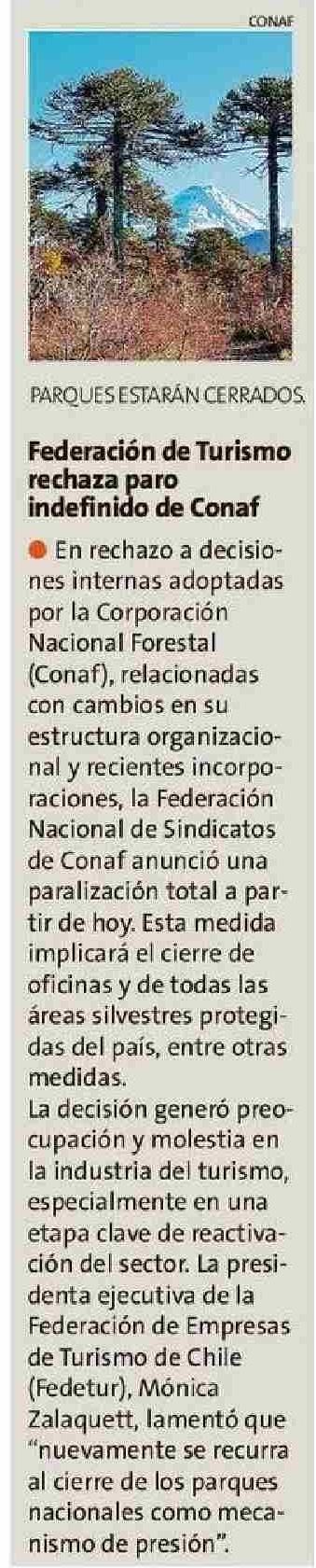 Federación de Turismo rechaza paro indefinido de Conaf