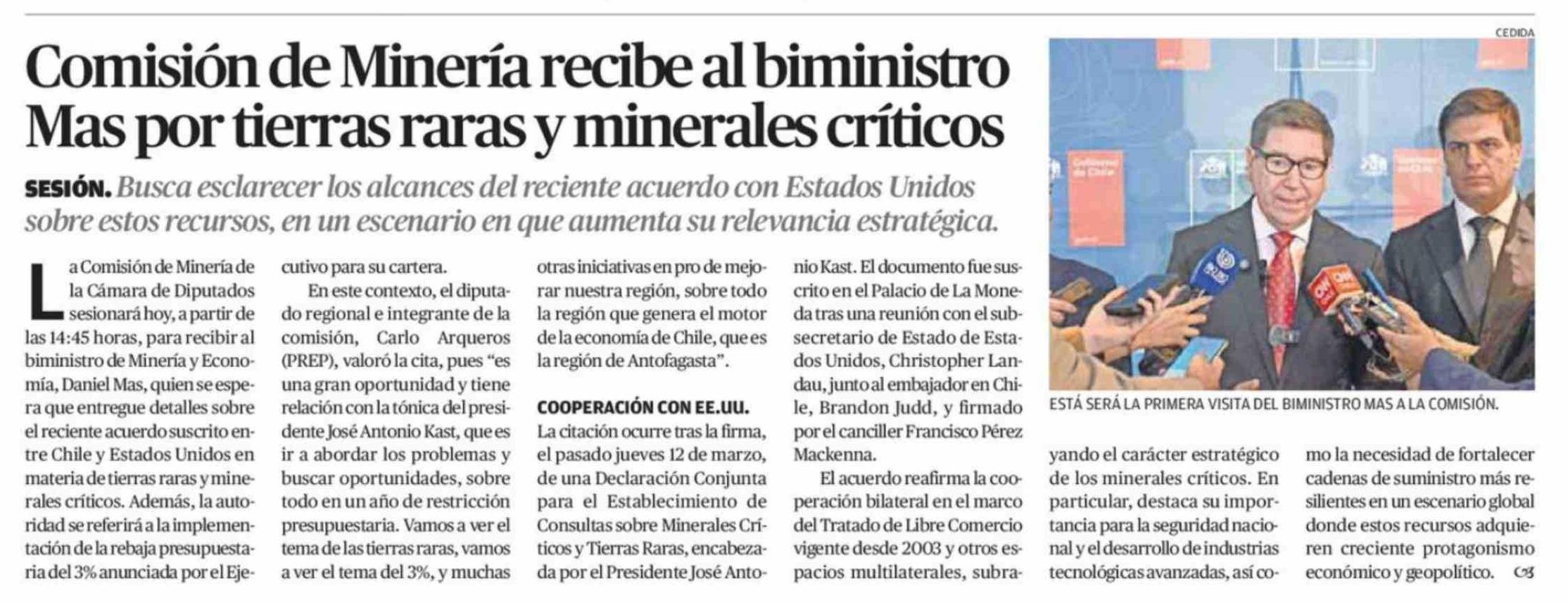 Comisión de Minería recibe al biministro Mas por tierras raras y minerales críticos