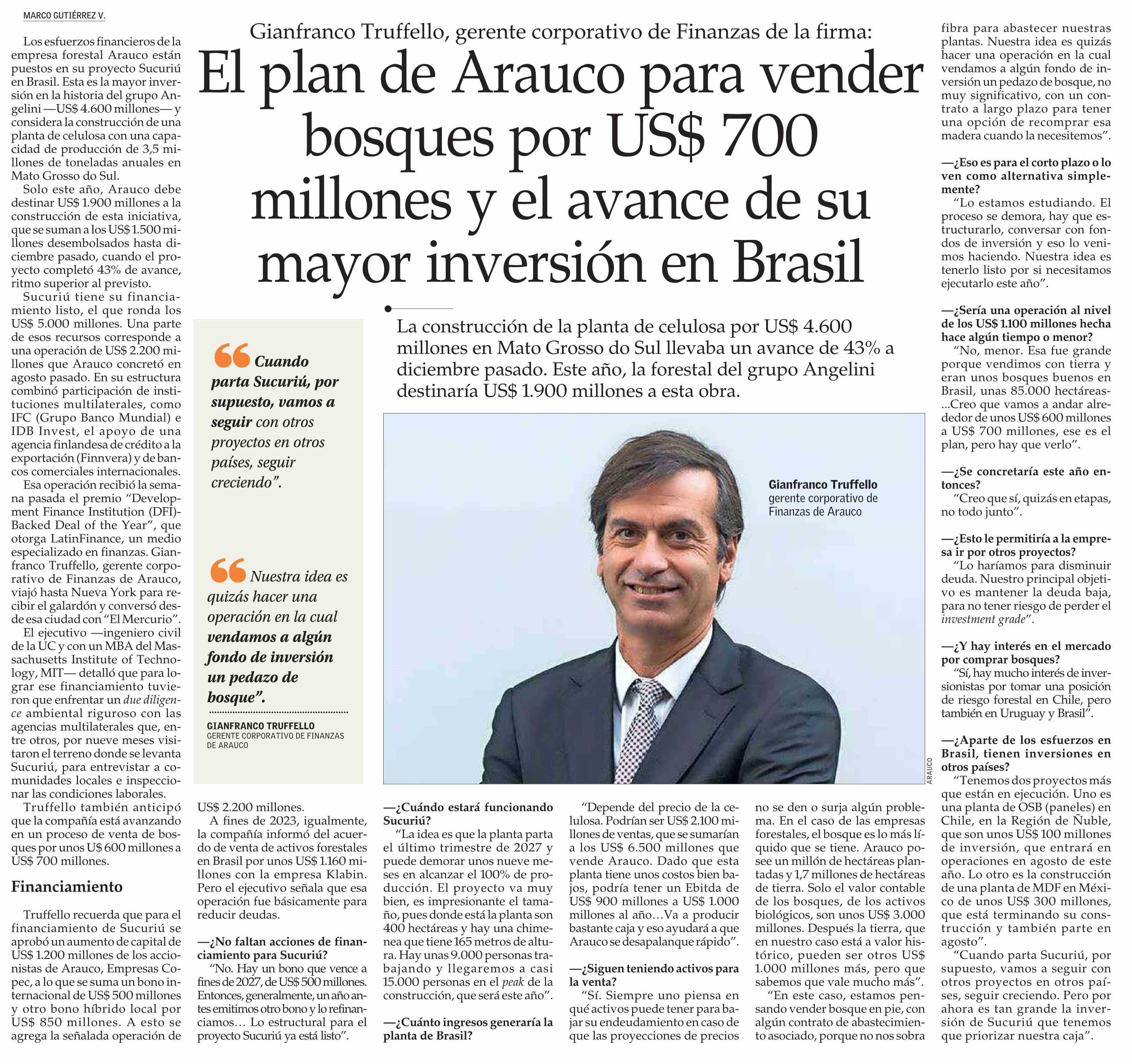 El plan de Arauco para vender bosques por US$ 700 millones y el avance de su mayor inversión en Brasil