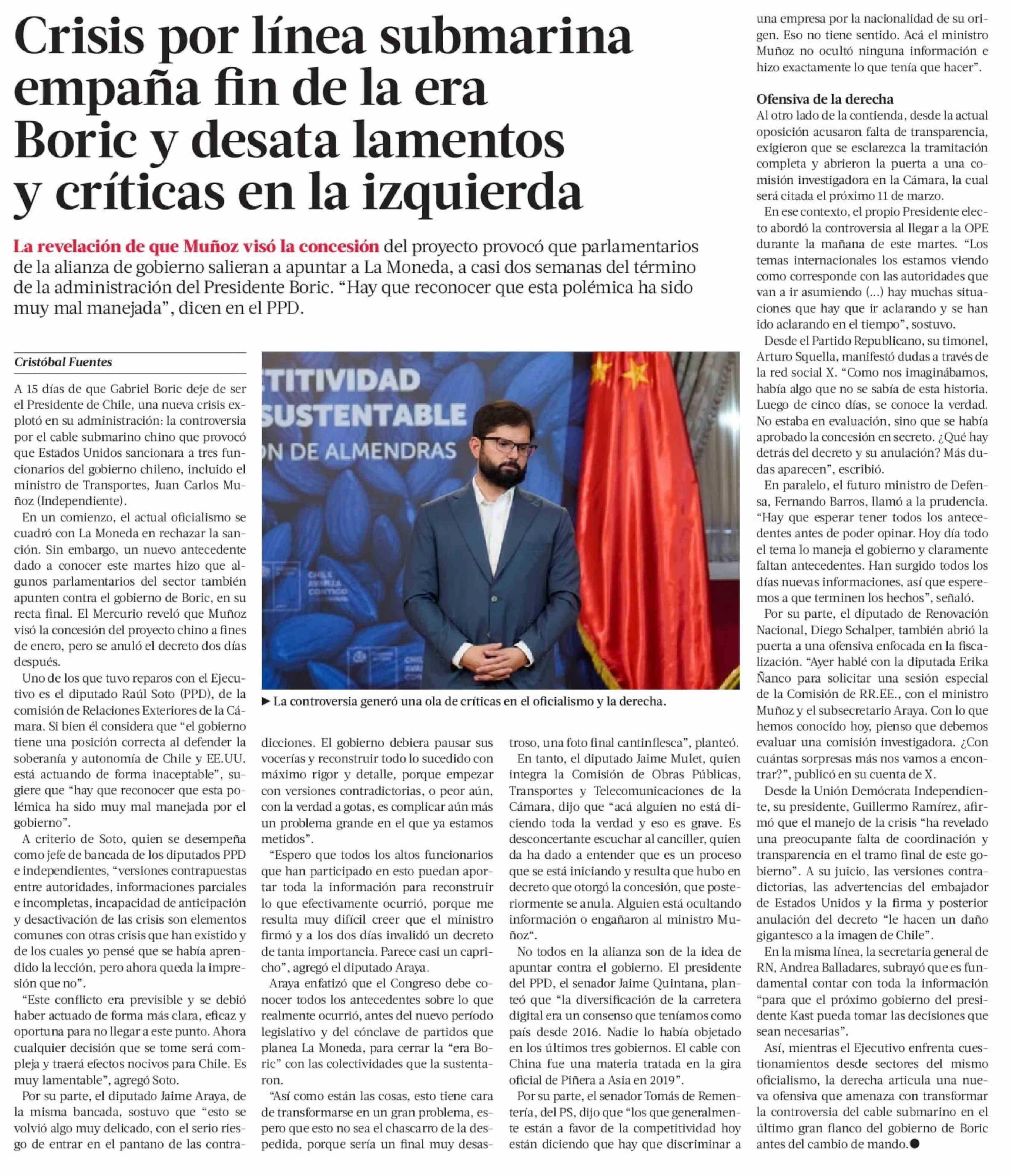Crisis por línea submarina empaña fin de la era Boric y desata lamentos y críticas en la izquierda