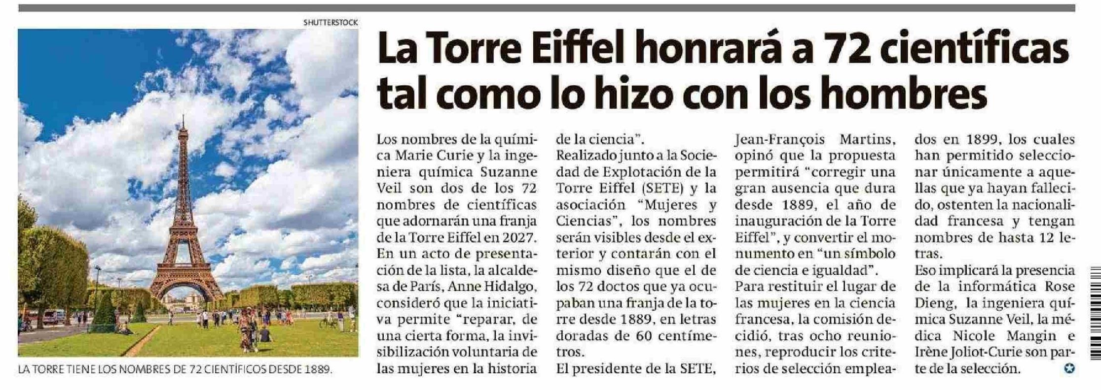 La Torre Eiffel honrará a 72 científicas tal como lo hizo con los hombres