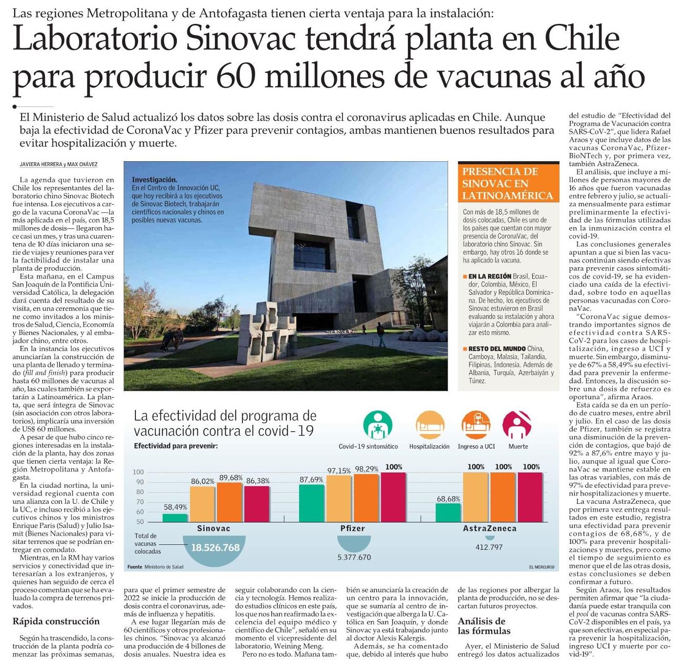 Laboratorio Sinovac tendrá planta en Chile para producir 60 millones de vacunas al año