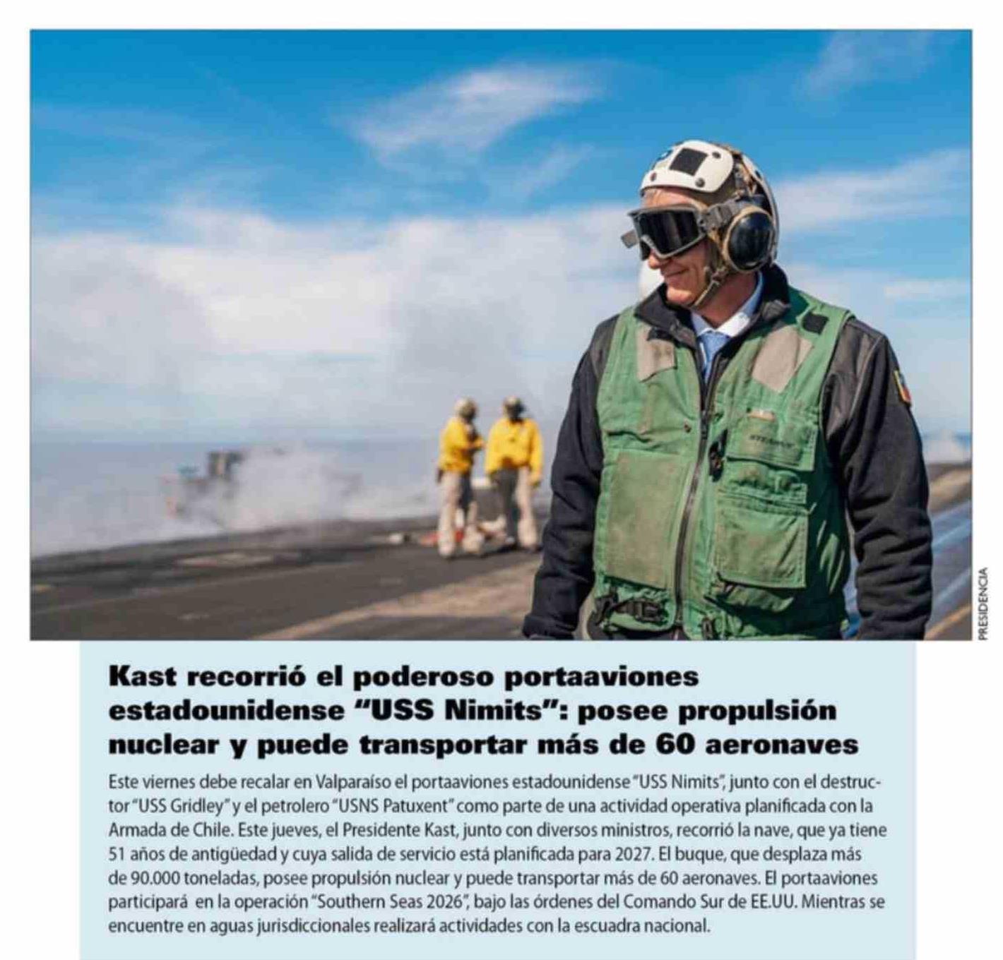 | Título: | Kast recorrió el poderoso portaaviones estadounidense "USS Nimits": posee propulsión nuclear y puede transportar más de 60 aeronaves |