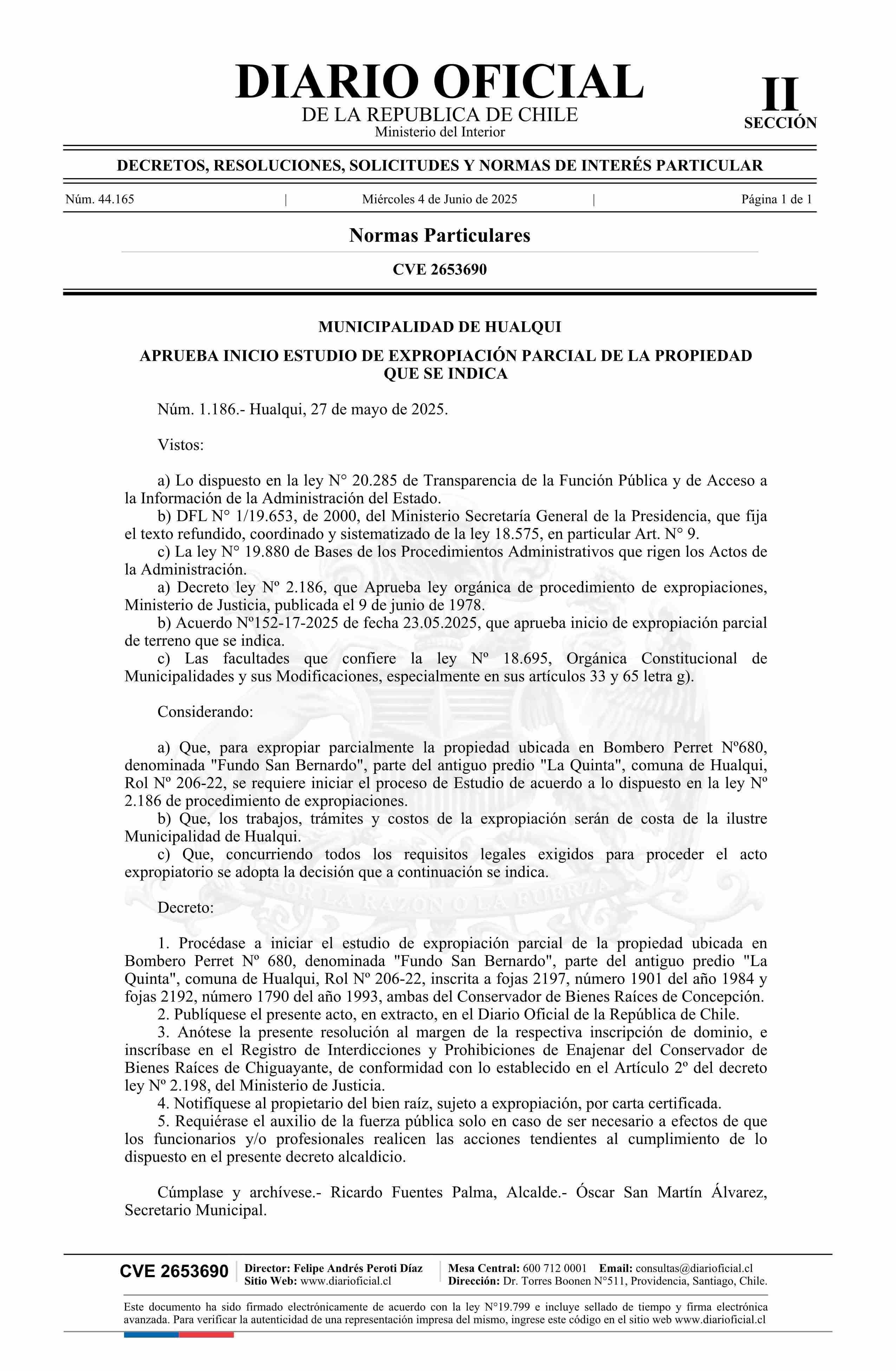 | Título: | Decreto alcaldicio número 1.186, de 2025.- Aprueba inicio estudio de expropiación parcial de propiedad que indica |