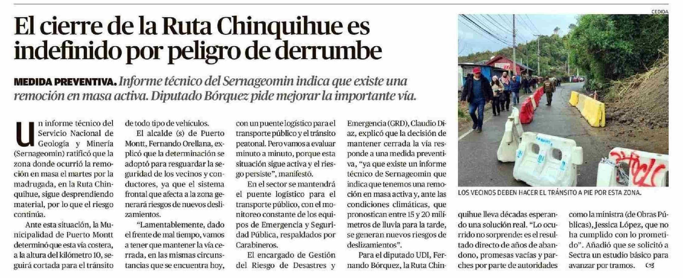 El cierre de la Ruta Chinquihue es indefinido por peligro de derrumbe