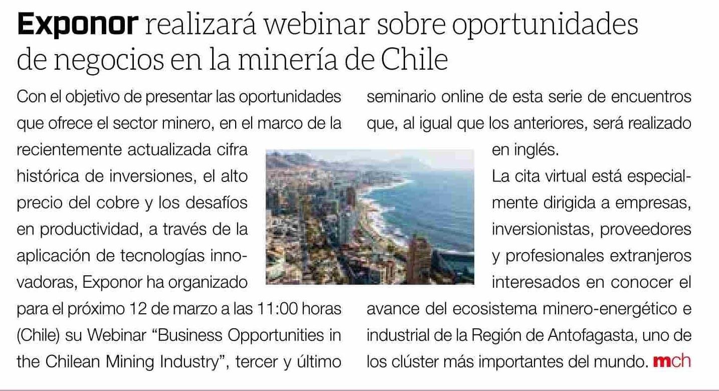 EXPONOR realizará webinar sobre oportunidades de negocios en la minería de Chile