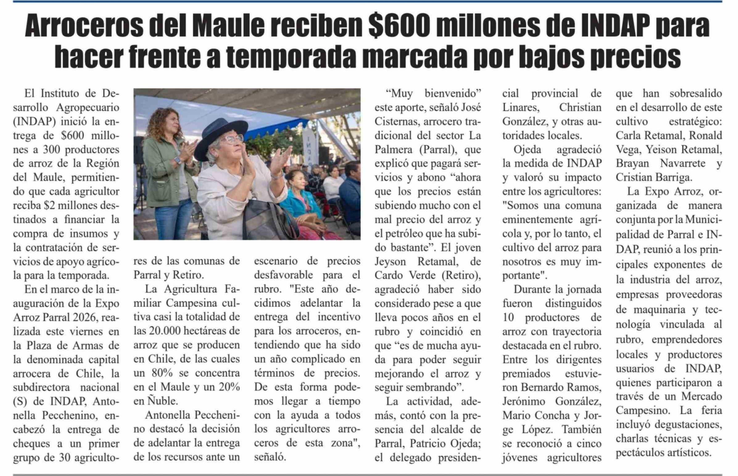 Título: Arroceros del Maule reciben $600 millones de INDAP para hacer frente a temporada marcada por bajos precios