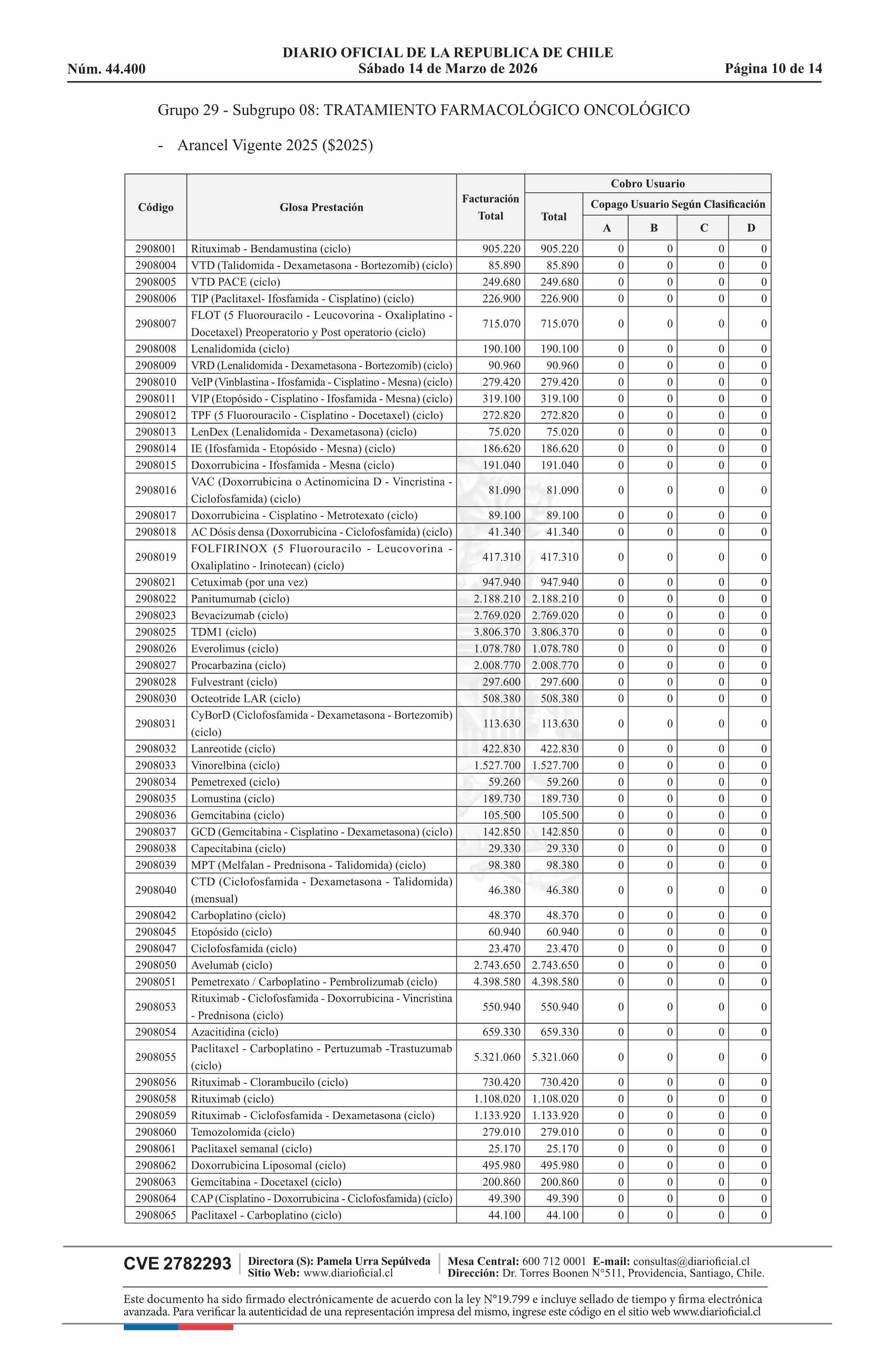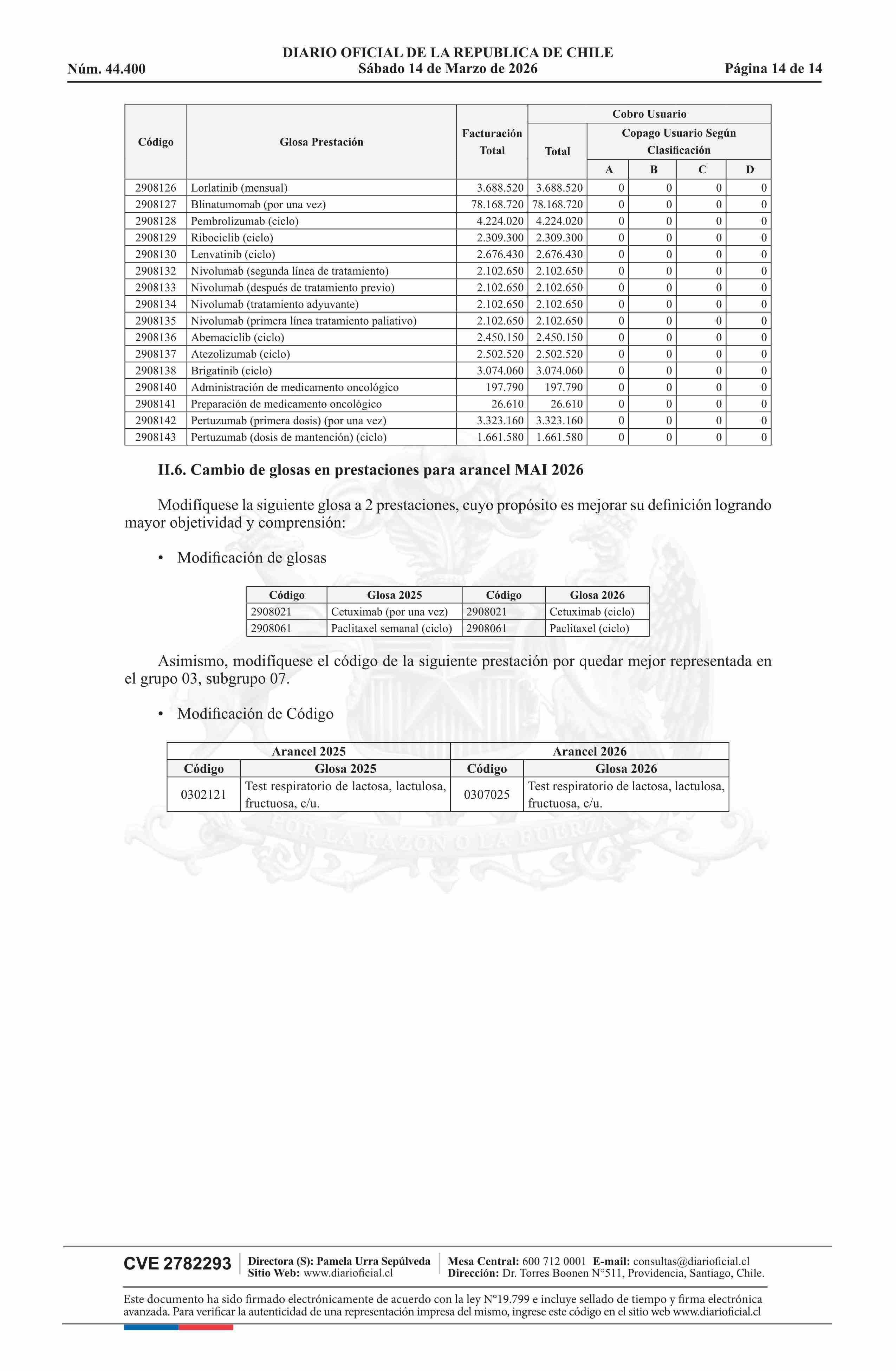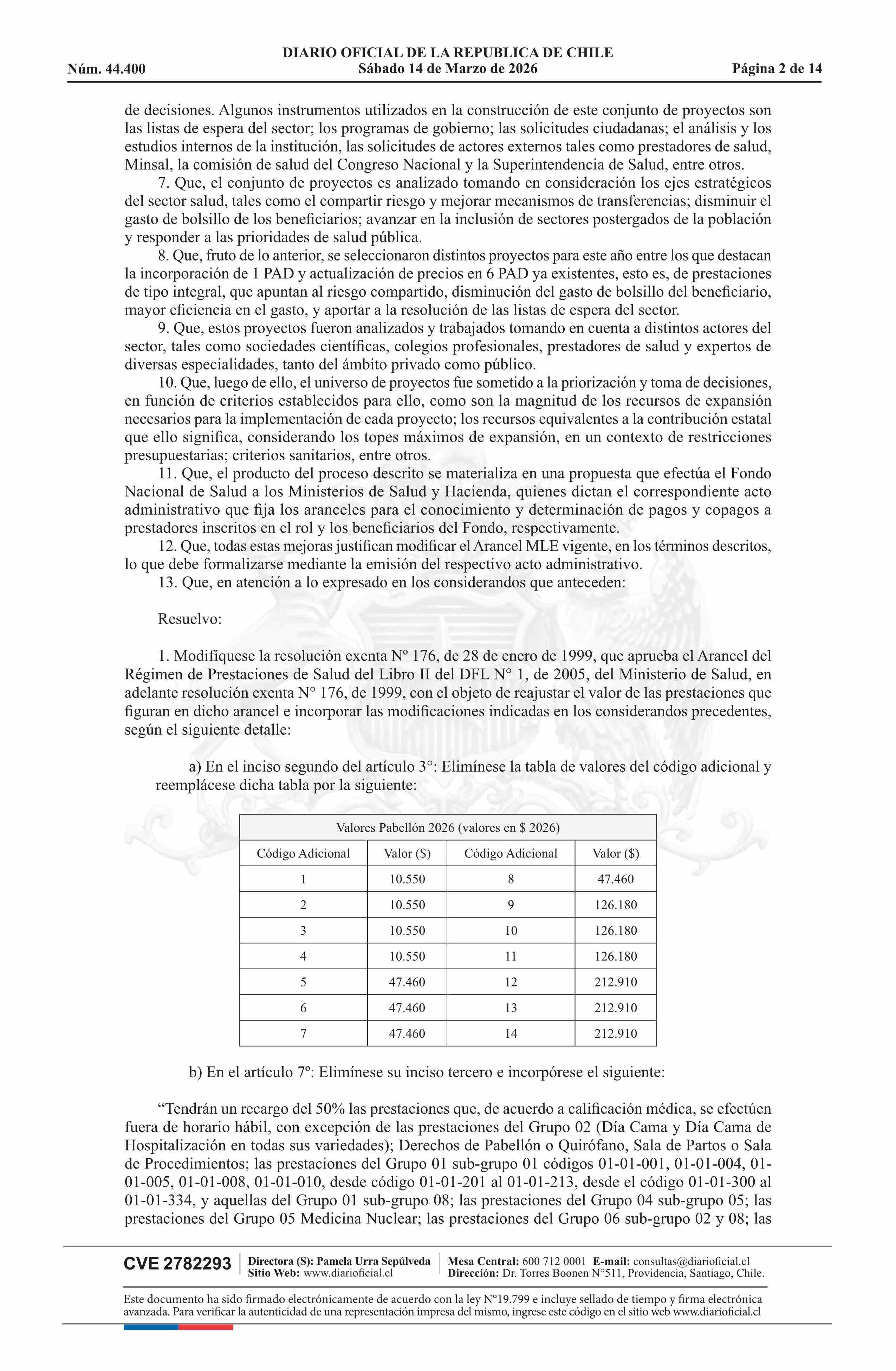 | Título: | Resolución exenta número 347, de 2026.- Modifica resolución N° 176 exenta, de 1999, que aprueba Arancel de Prestaciones de Salud, del decreto con fuerza de ley N° 1, de 2005 |