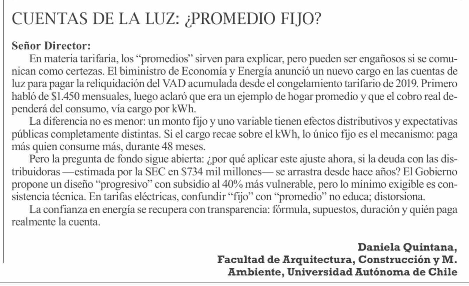 Cartas: CUENTAS DE LA LUZ: ¿ PROMEDIO FIJO?