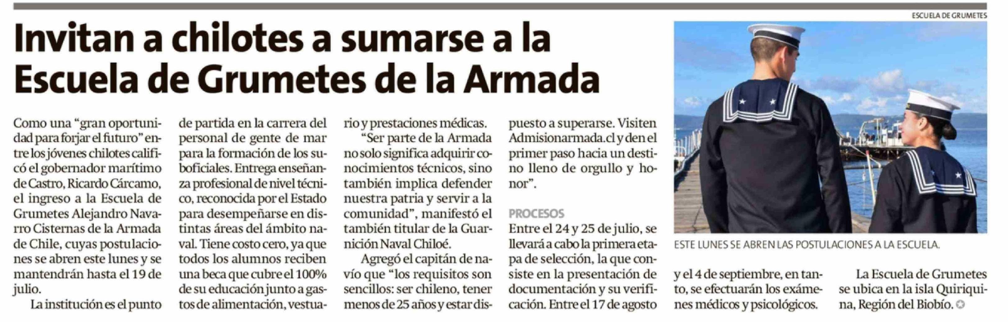 Invitan a chilotes a sumarse a la Escuela de Grumetes de la Armada