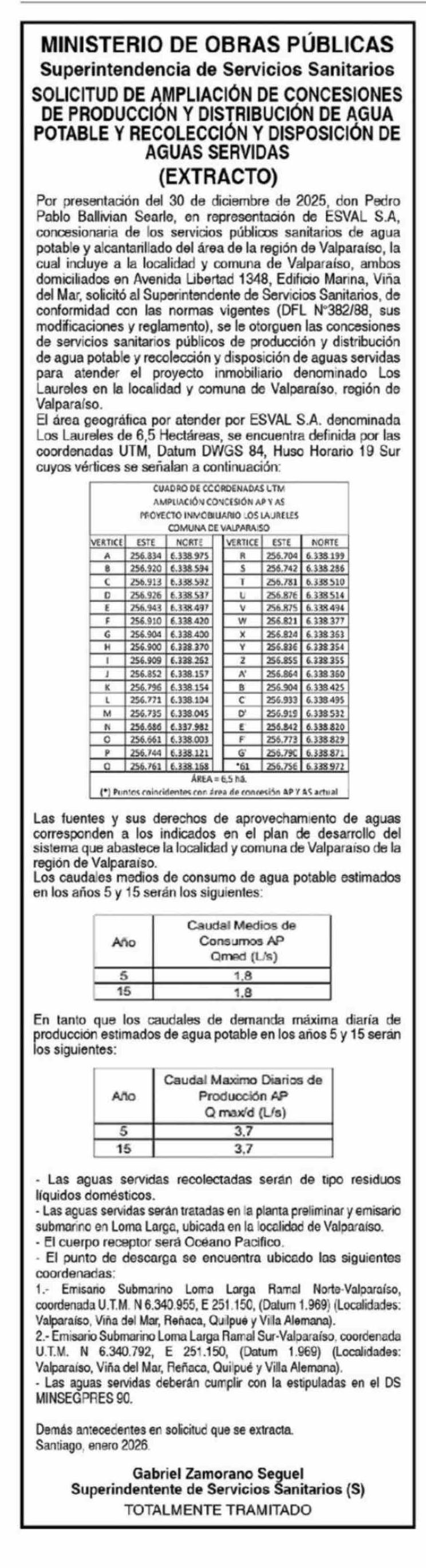 | Título: | Extractos: MINISTERIO DE OBRAS PÚBLICAS Superintendencia de Servicios Sanitarios SOLICITUD DE AMPLIACIÓN DE CONCESIONES DE PRODUCCIÓN Y DISTRIBUCIÓN DE AGUA POTABLE Y RECOLECCIÓN Y DISPOSICIÓN DE AGUAS SERVIDAS (EXTRACTO) Por presentación del 30 de diciembre de 2025, don Pedro Pablo Ballivian Searle |