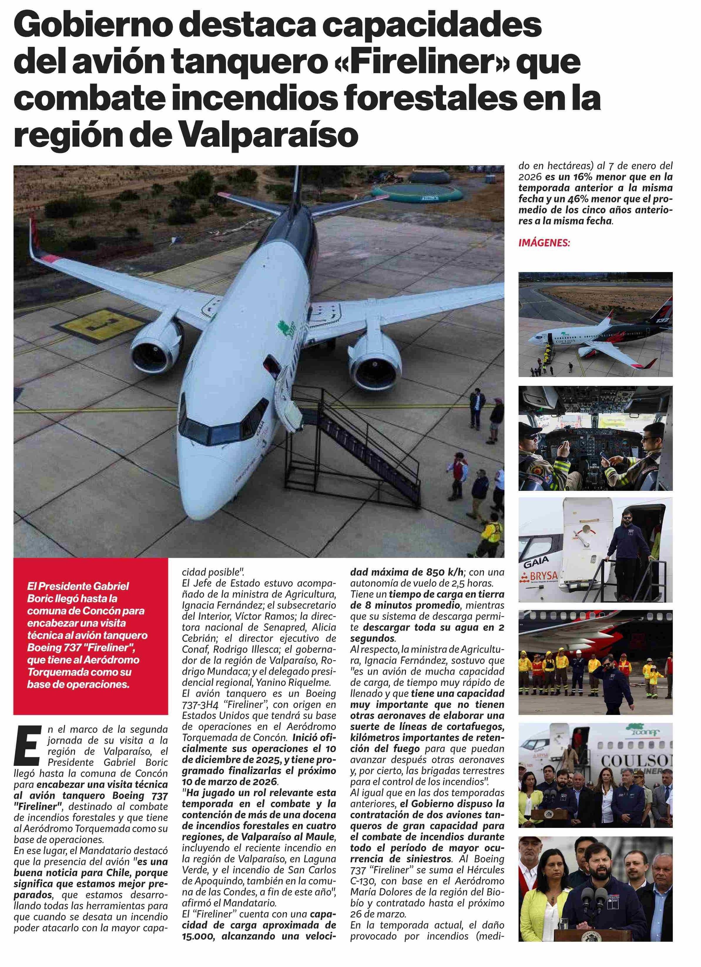 Gobierno destaca capacidades del avión tanquero «Fireliner» que combate incendios forestales en la región de Valparaíso