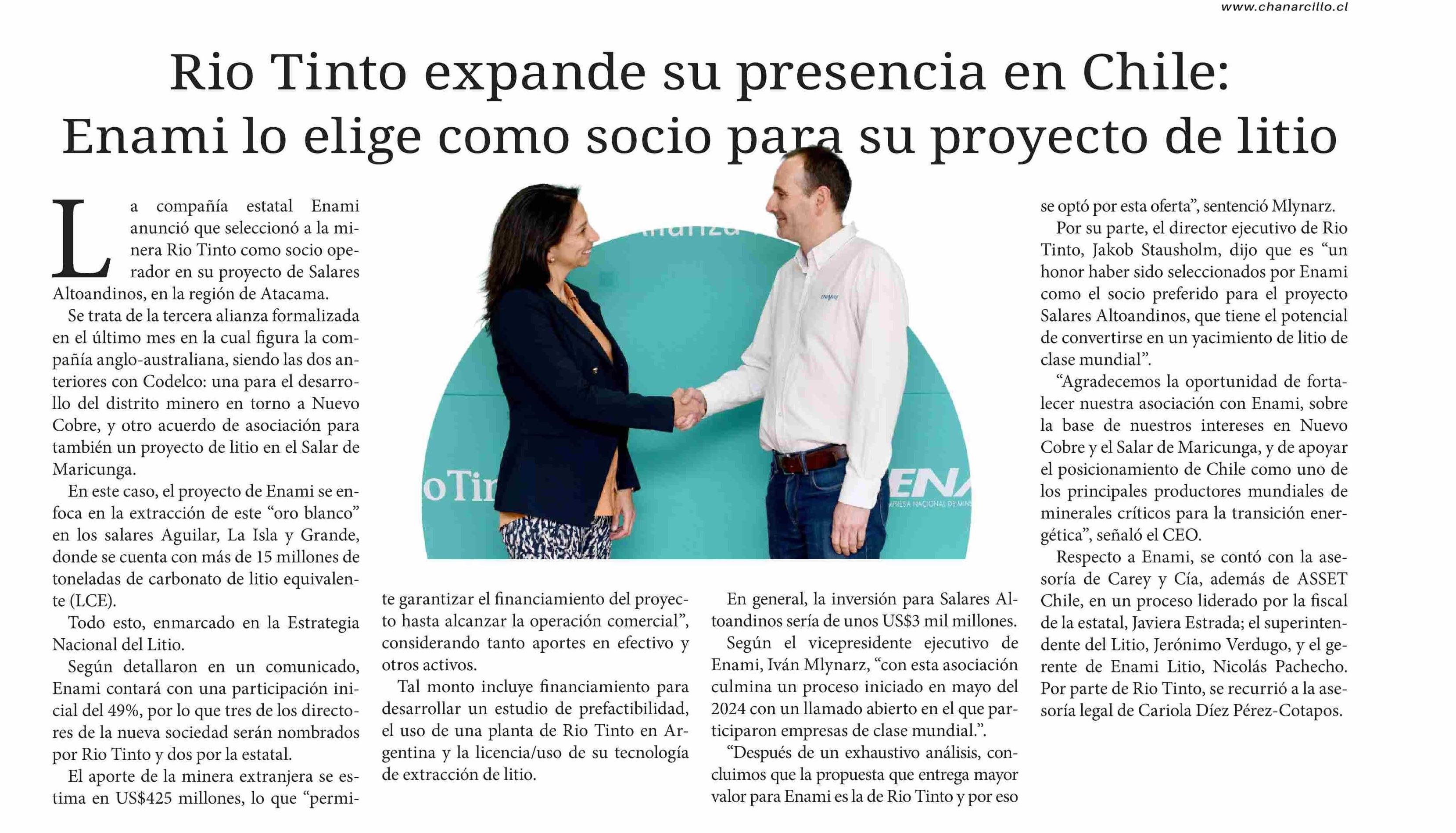 Rio Tinto expande su presencia en Chile: Enami lo elige como socio para su proyecto de litio