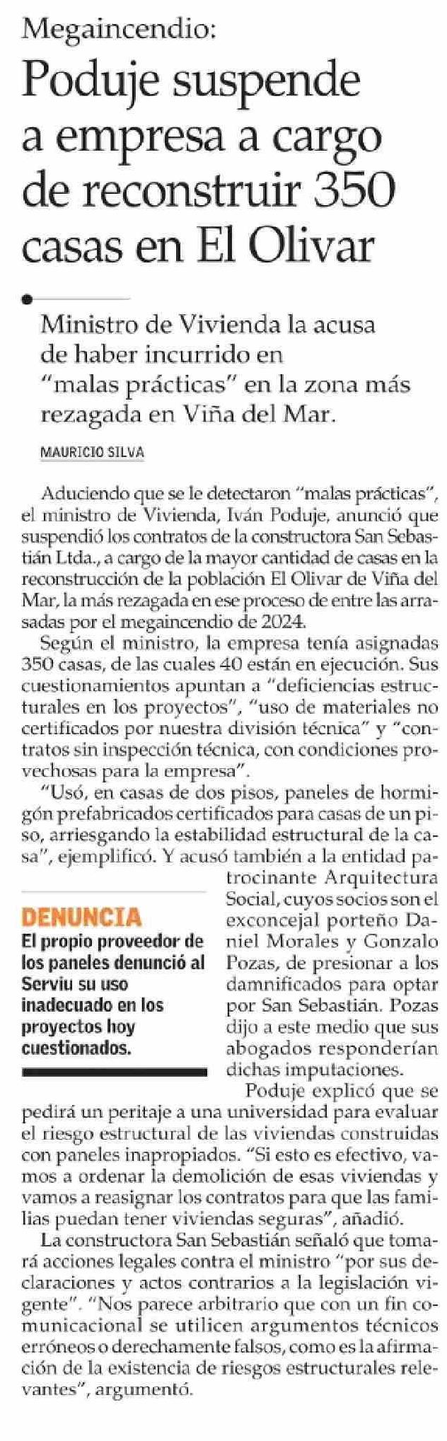 Poduje suspende a empresa a cargo de reconstruir 350 casas en El Olivar