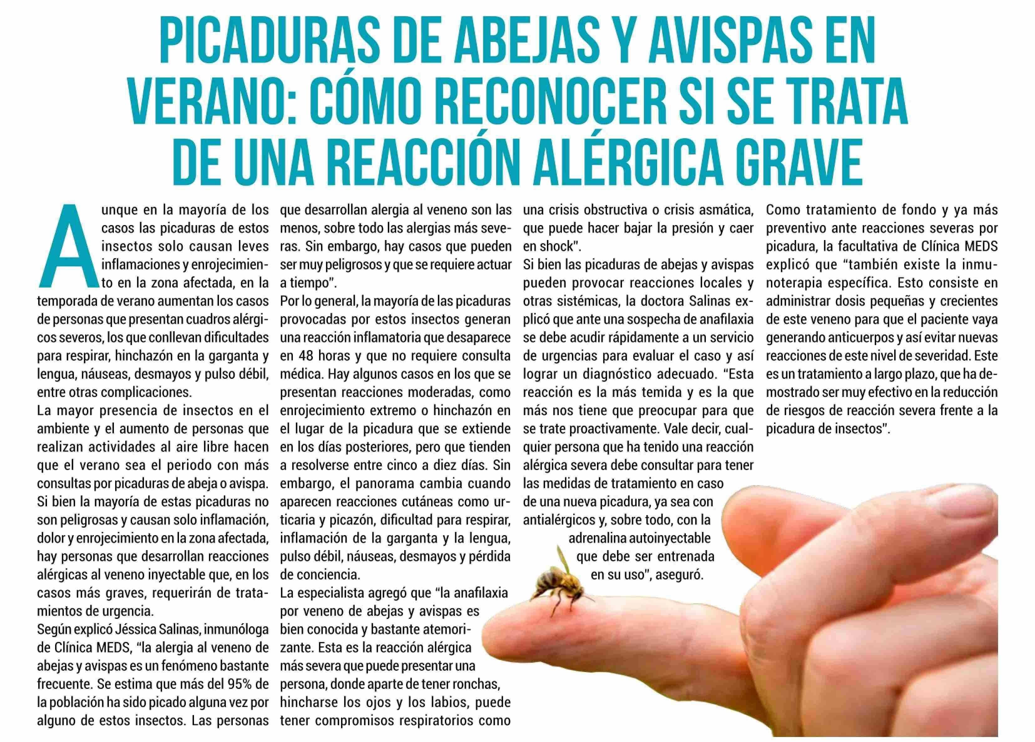 Título: PICADURAS DE ABEJAS Y AVISPAS EN VERANO: COMO RECONOCER SI SE TRATA DE UNA REACCION ALÉRGICA GRAVE
