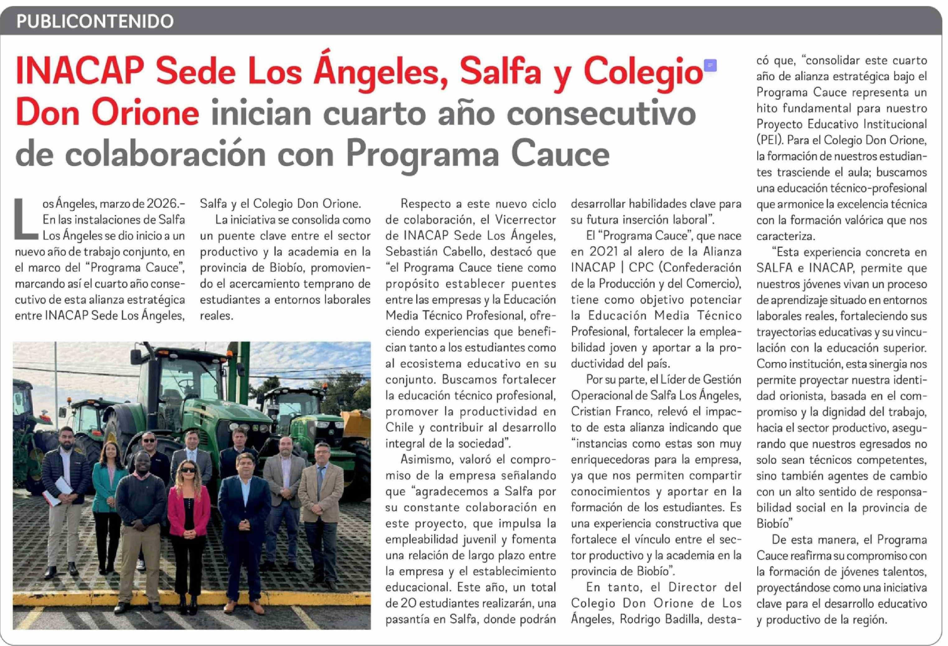 Título: INACAP Sede Los Angeles, Salfa y Colegio Don Orione inician cuarto año consecutivo de colaboración con Programa Cauce