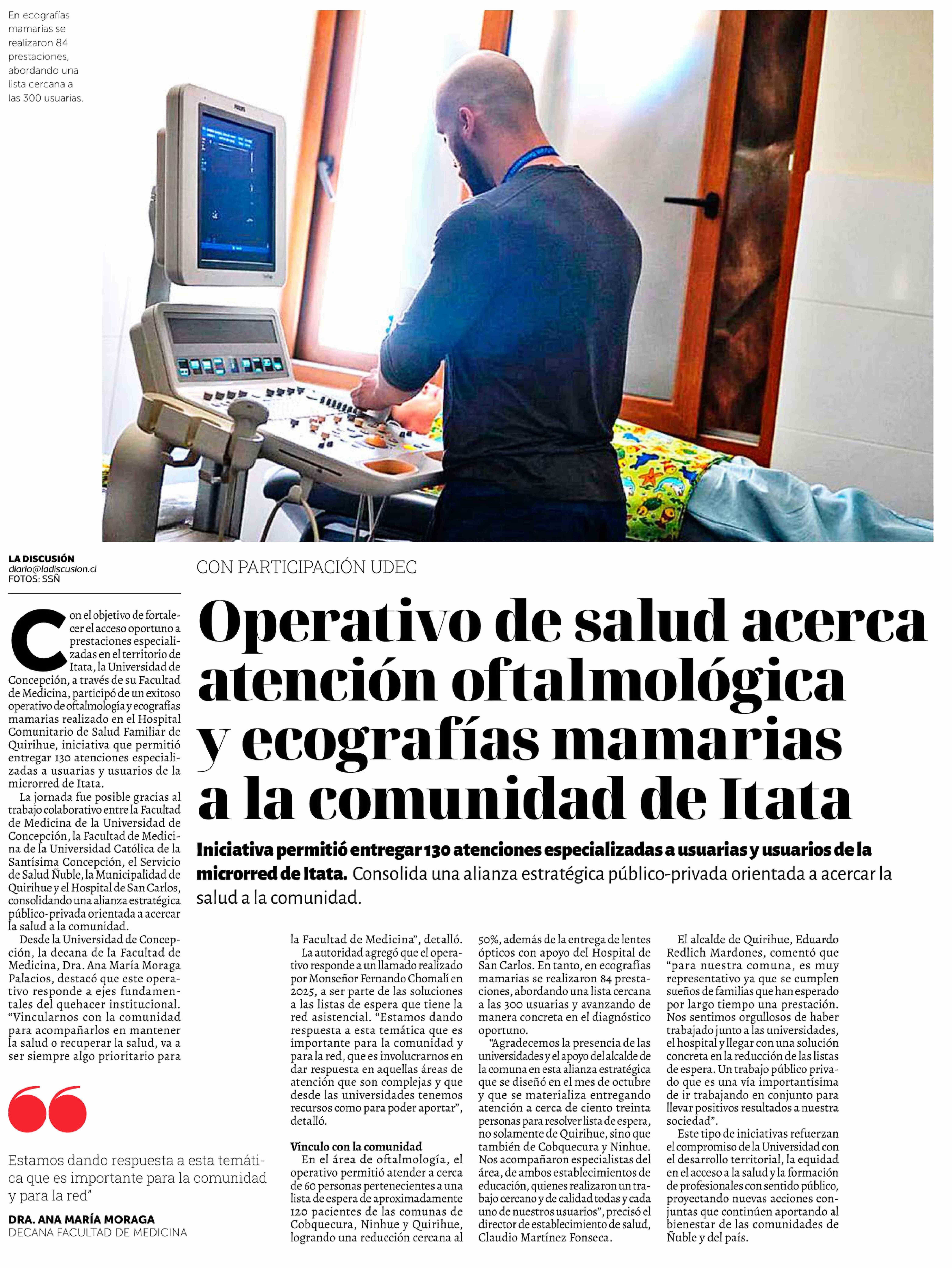 Operativo de salud acerca atención oftalmológica y ecografías mamarias a la comunidad de Itata