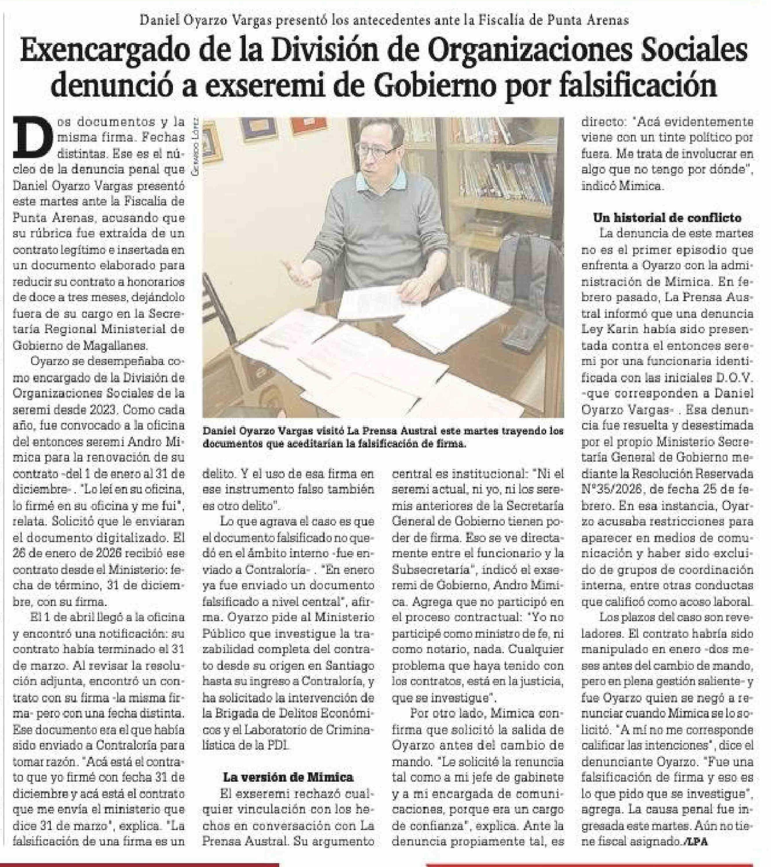 Exencargado de la División de Organizaciones Sociales denunció a exseremi de Gobierno por falsificación