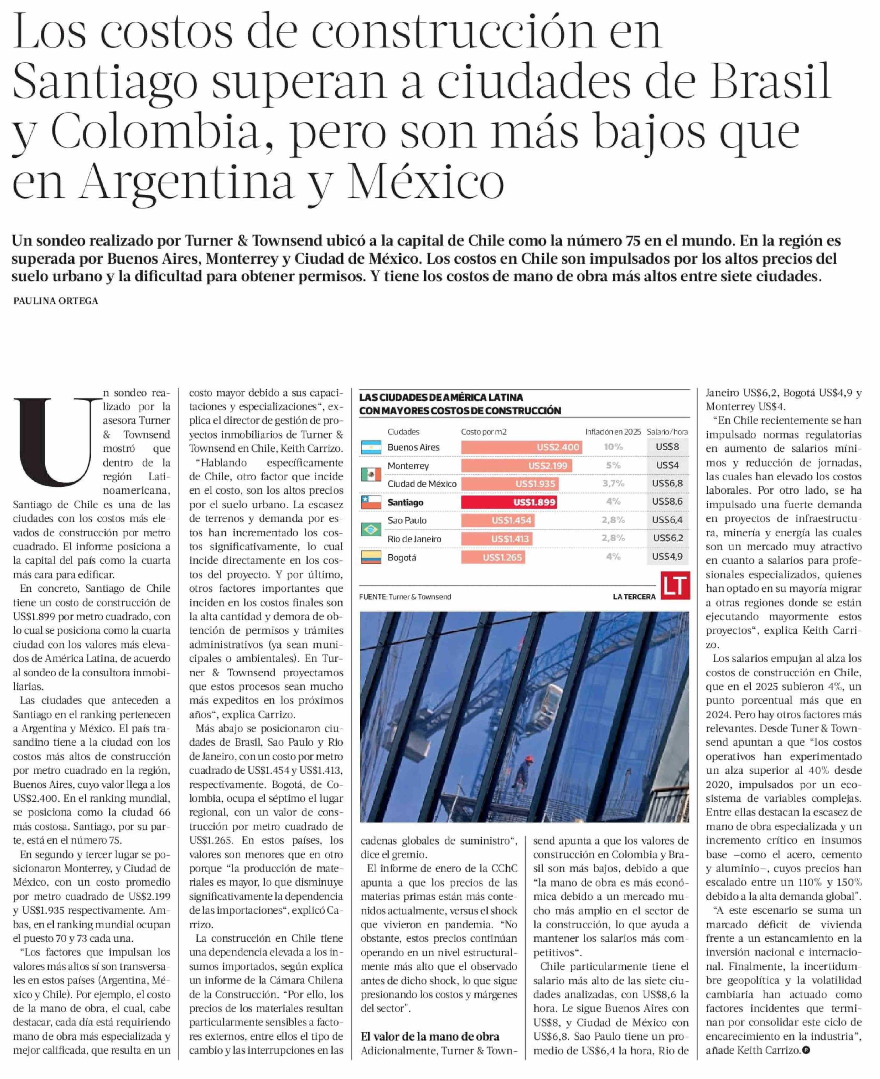 Los costos de construcción en Santiago superan a ciudades de Brasil y Colombia, pero son más bajos que en Argentina y México