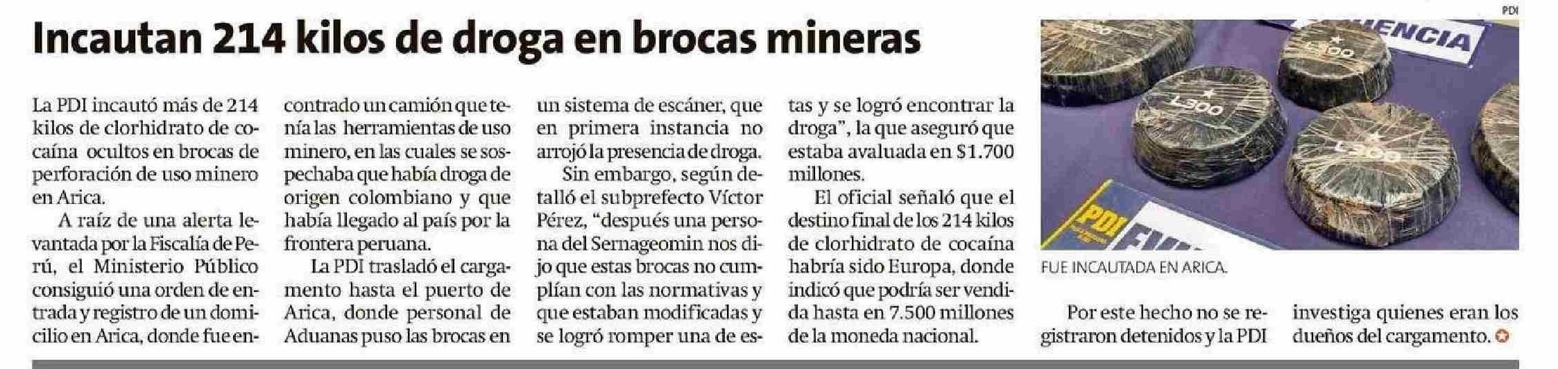 Incautan 214 kilos de droga en brocas mineras