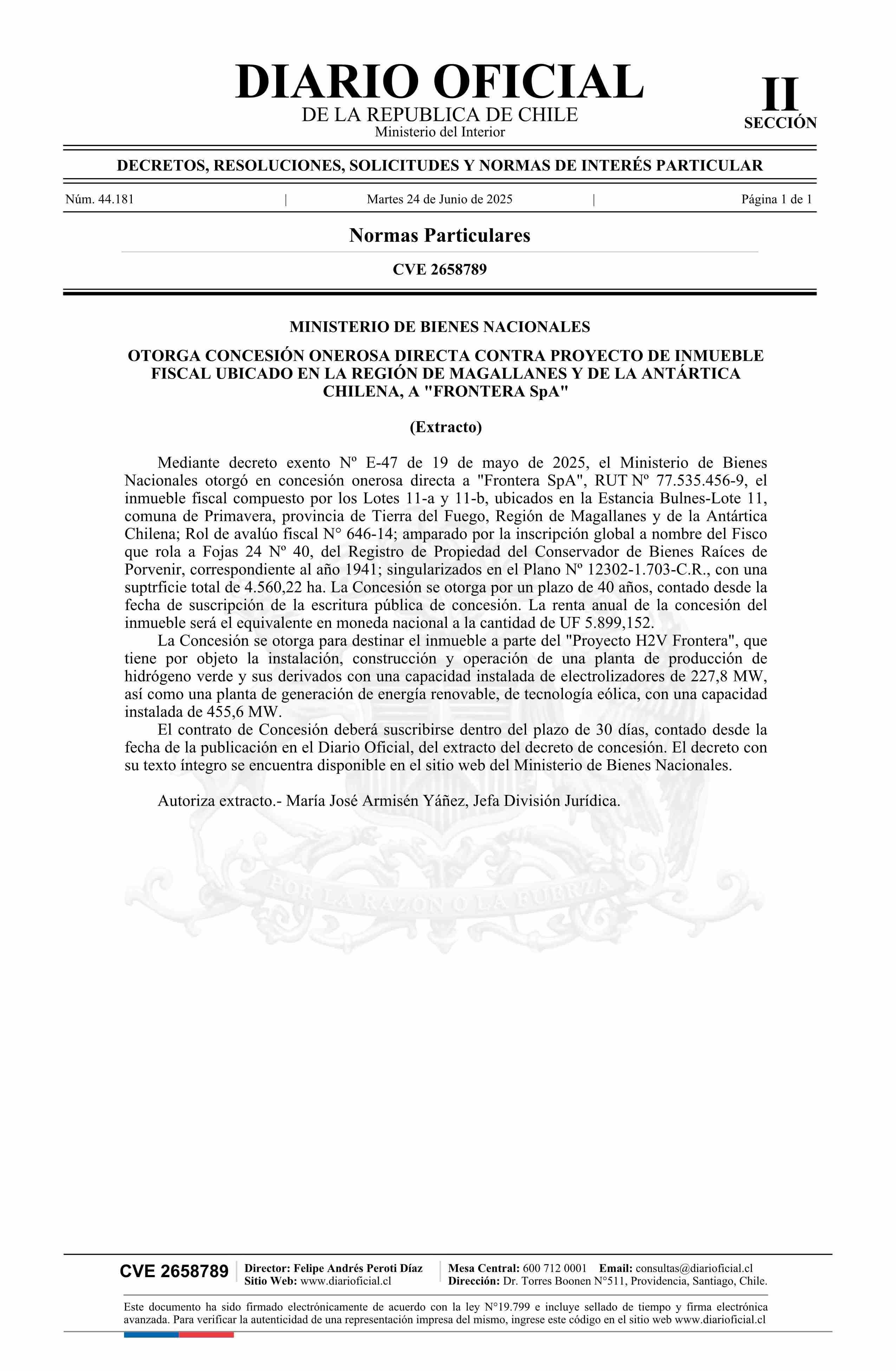 | Título: | Extracto de decreto exento número E-47, de 2025.- Otorga concesión onerosa directa contra proyecto de inmueble fiscal ubicado en la Región de Magallanes y de la Antártica Chilena, a Frontera SpA |